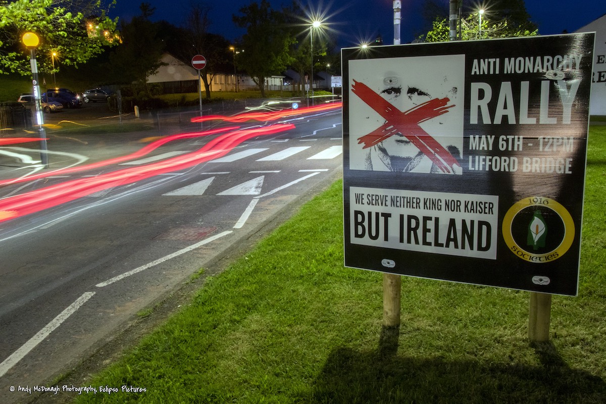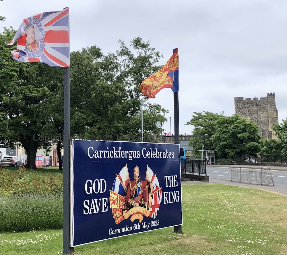On the left, the past – Her Majesty Queen Elizabeth II; in the centre, the present – His Majesty King Charles III; on the right, the future – William Prince Of Wales, Baron Of [sic] Carrickfergus.