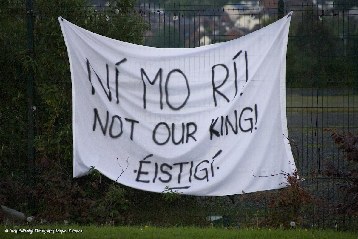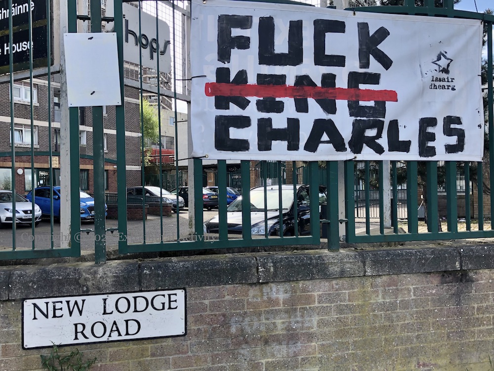 Here are two more responses to the coronation of King Charles last weekend: (above and last) a Lasaır Dhearg (web) tarp in north Belfast reading “Fuck King Charles”; immediately below, an Éıstıgí (web) sheet/flag reading “Ní Mo Rí [Ní hé mo rí é/[he is] not my king]. Not our king.” in Strand Road, Derry.
