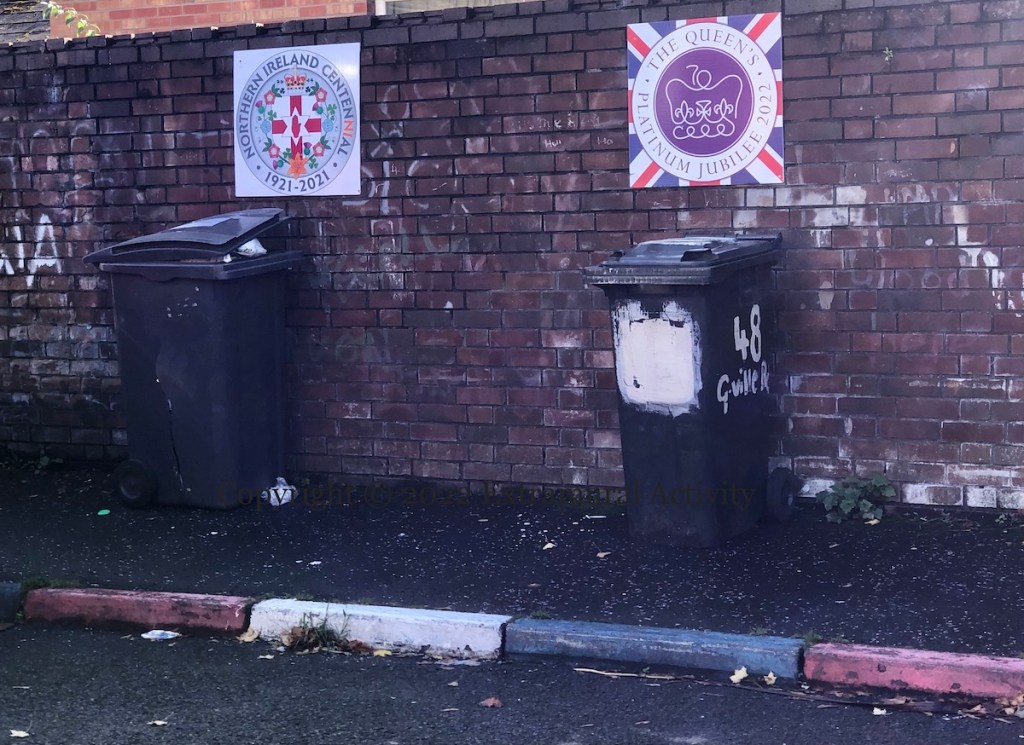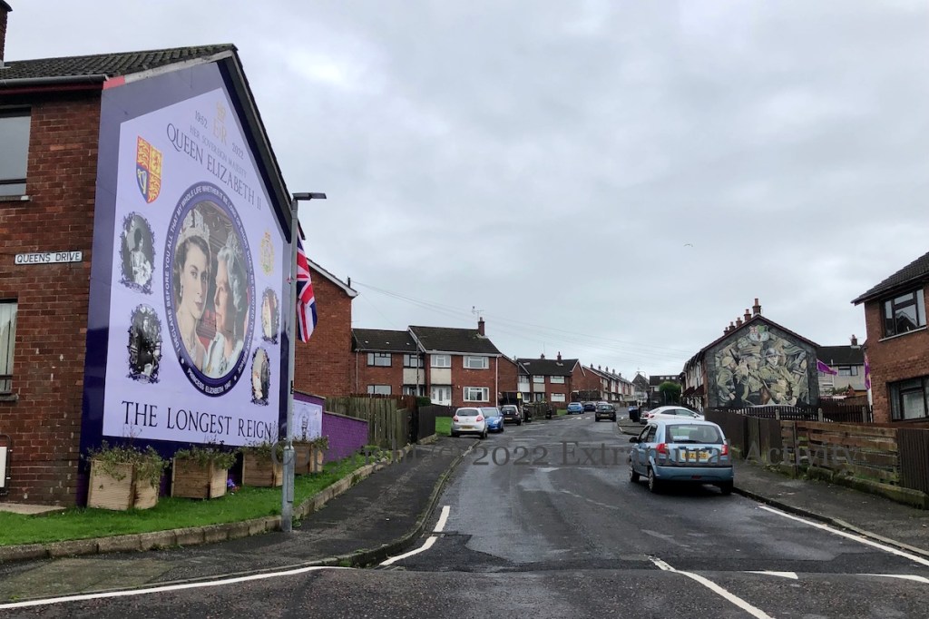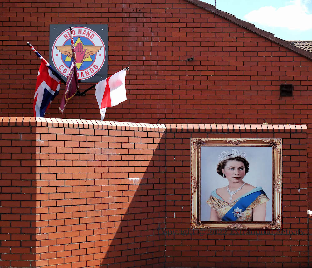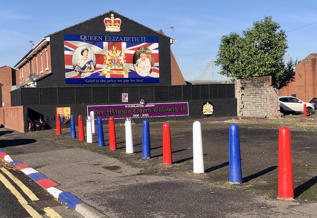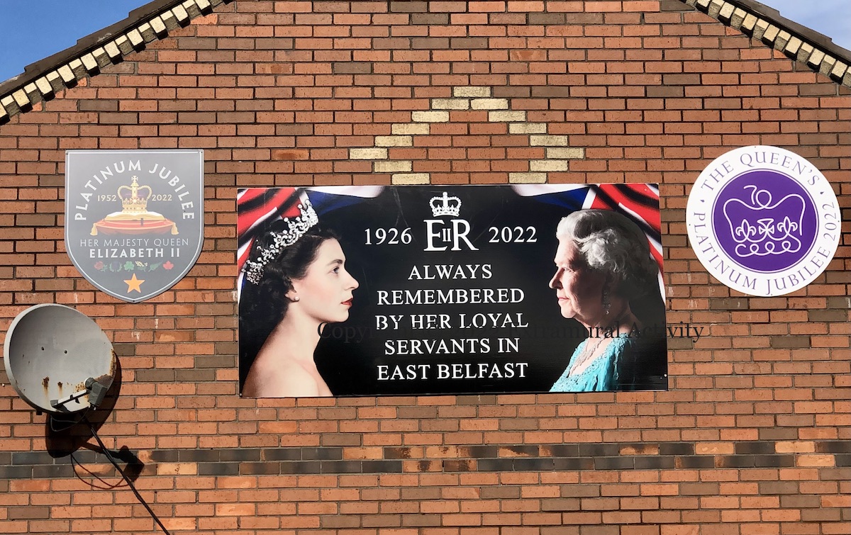 All the emblems of an eventful summer for loyalism: the centenary of Norther Ireland was celebrated on May 3rd, Queen Elizabeths platinum jubilee was celebrated in the first week of June, and then she died on September 8th, at the age of 96. “ERII 1926-2022. Always remembered by her loyal servants in east Belfast.”