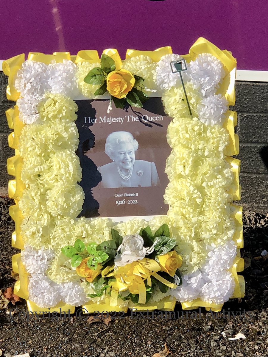Upon news of Queen Elizabeth’s death, the platinum jubilee mural at the bottom of Crimea Street became a memorial, with hundreds of bouquets being laid before it and a “wall of condolences” set up. (For the mural itself, see The People’s Monarch.) In addition, to the right-hand side has been added a small commemoration of her passing, with a quote from her son, the newly acceded King Charles: