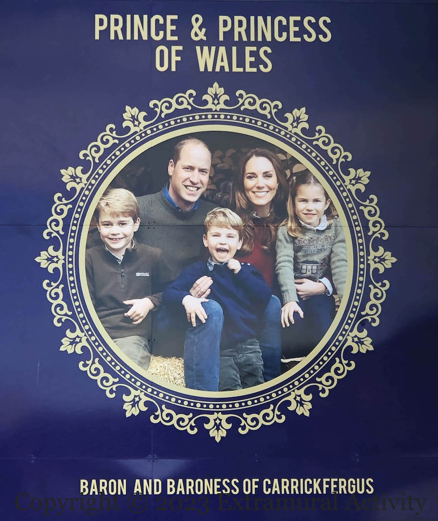 Four generations of UK royalty: the previous Queen Elizabeth II, the current King Charles III, the heir apparent William, baron Carrickfergus – here written as “baron of Carrickfergus” (also the prince of Wales), and his nine-year-old son George. Charles’s coronation will be on May 6th, 2023.