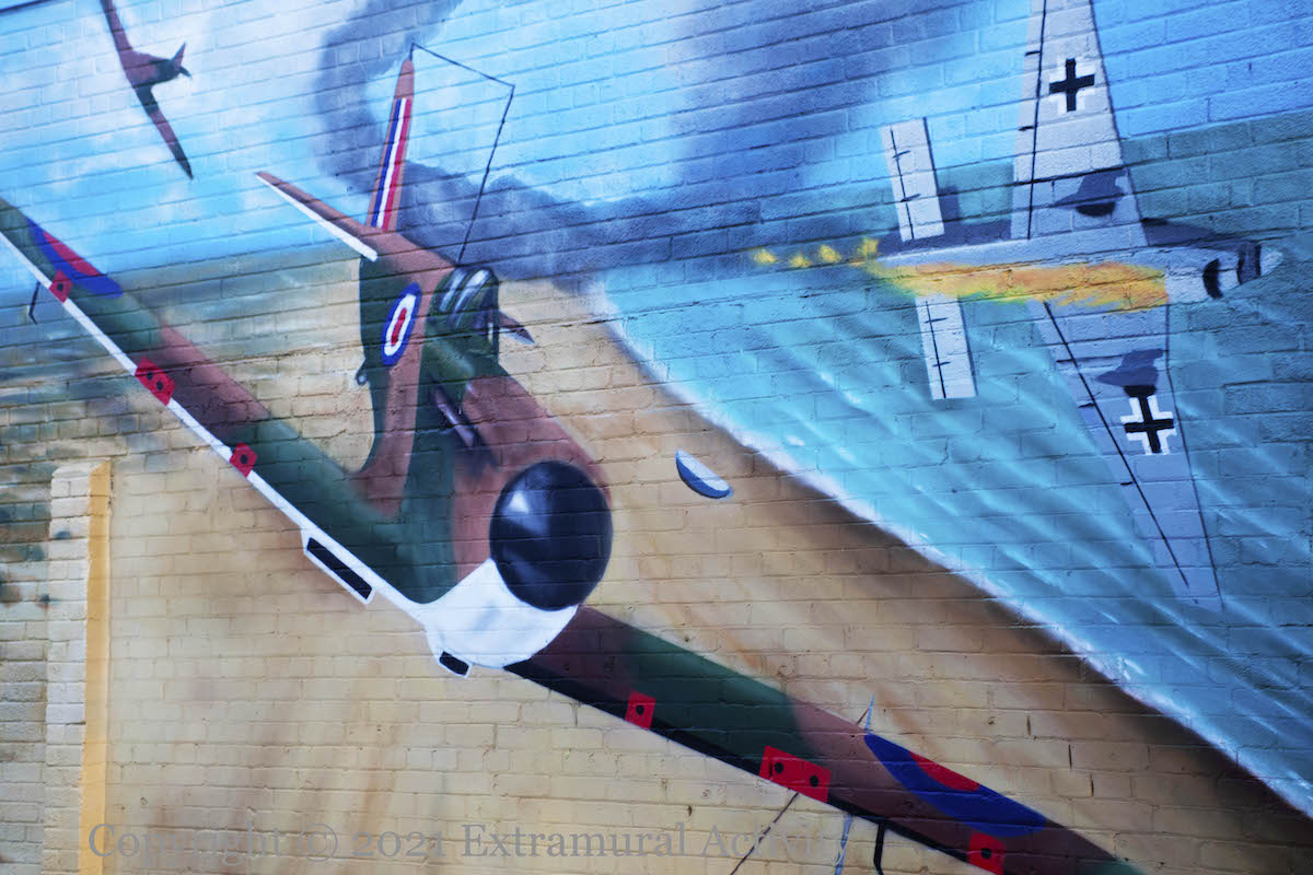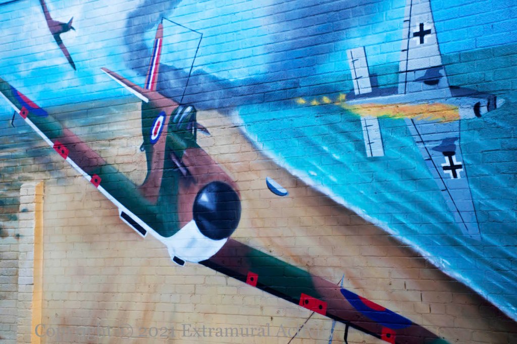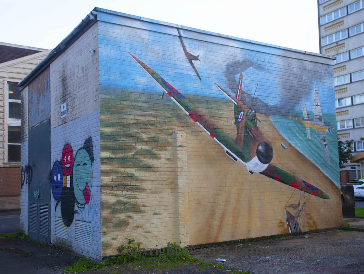The mural, by Glen Molloy, reproduces Mark Postlethwaite’s painting, Spitfires Over Dunkirk. Oddly, the mural is on the wall of the Clarawood substation that is not visible from any of the residences.