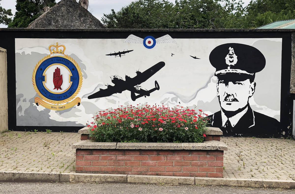 The Royal Air Force was established on April 1st, 1918 and in 1925 the 502 (Ulster) Squadron was formed at Aldergrove as a Special Reserve squadron (and later as an Royal Auxiliary Air Force squadron). The squadron flew bombing raids against enemy submarines and ships during the second World War, from a succession of bases, including Limavady, Norfolk, Cornwall, and Stornoway (WP). (The plane depicted is perhaps a Halifax from later in the war. The officer depicted is perhaps Robert Oxland, the first commanding officer.) The mural above, in Main Road, Glynn, was unveiled on August 20th, 2018 (Roy Beggs) to commemorate the Force’s 100th anniversary.