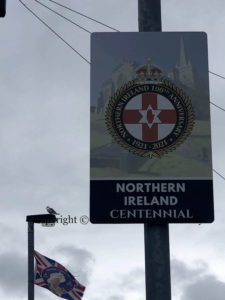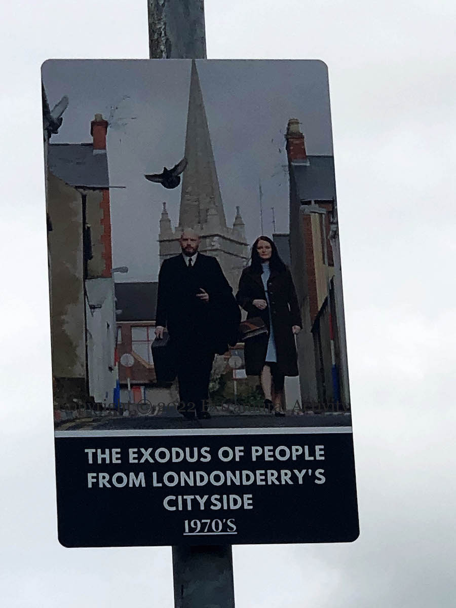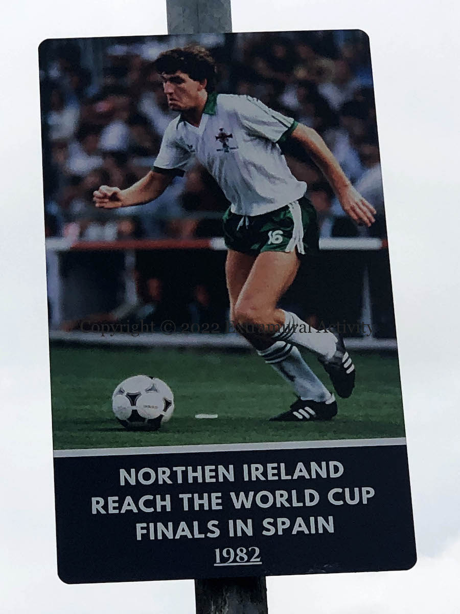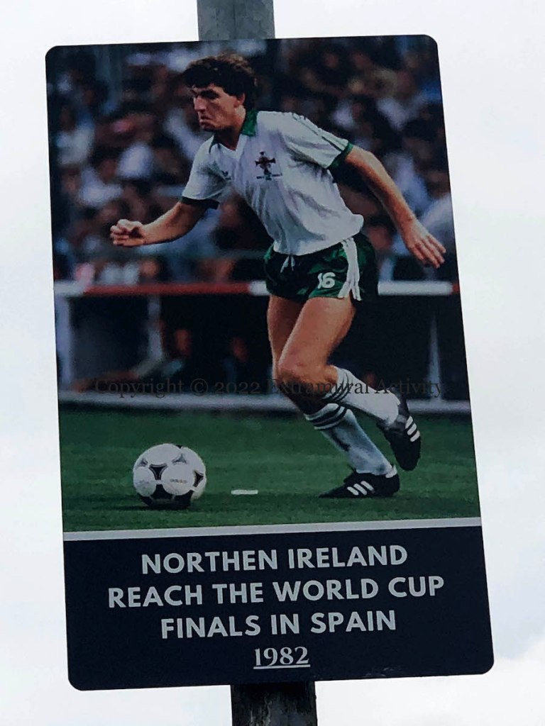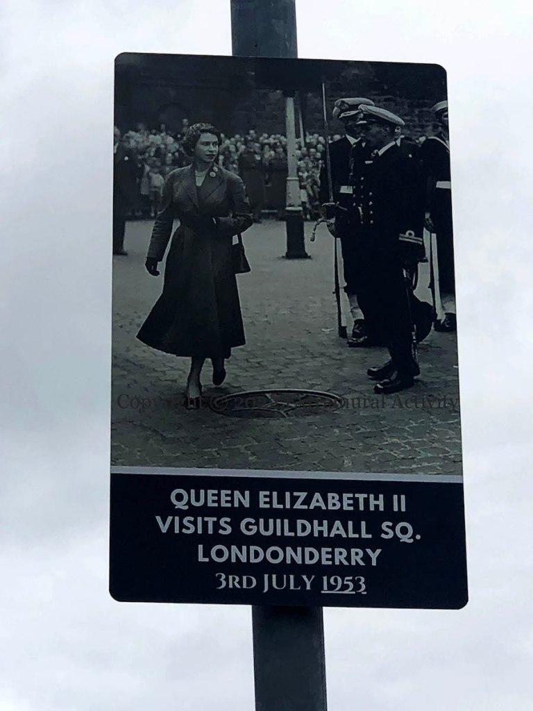 Here is a 12-part history of Northern Ireland (and specifically Londonderry) along the length of Sperrin Park in the Caw. After the title panel, the topics are: King George V opens Norther Ireland Parliament, 22nd June, 1921; Amelia Earhart crosses the Atlantic & lands in Londonderry 21st May, 1932; Operation Deadlight: surrender of German U-boats at Lisahally 14th May, 1945; Queen Elizabeth II visits Guildhall Sq. Londonderry 3rd July, 1951; opening of Altnagelvin hospital 1st February, 1960; the exodus of people from Londonderry’s Cityside 1970s; Northern Ireland reach the World Cup finals in Spain 1982; first Maiden City Festival takes place August, 1998; end of ‘Operation Banner’ 31st July, 2007; Londonderry named first UK City Of Culture 2013; Prince Philip the Duke Of Edinburgh 1921-2021.