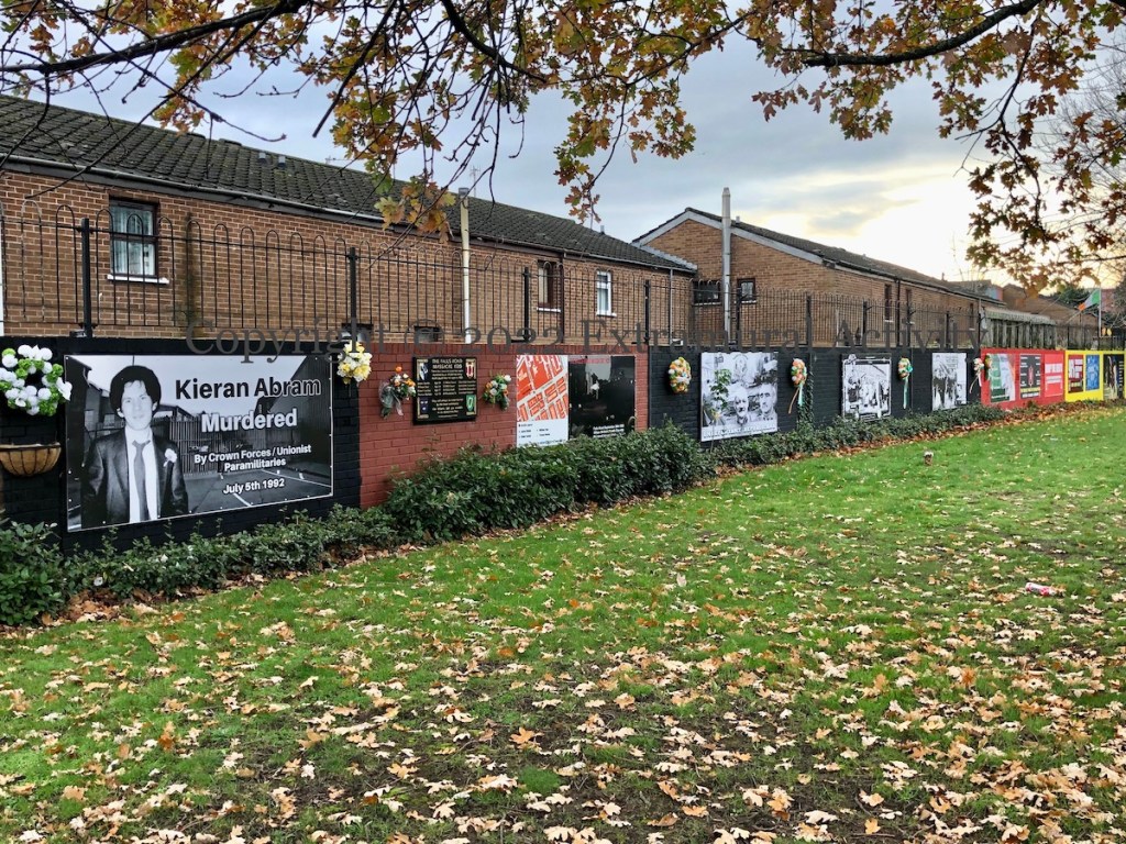 As the wide shots below show, there are now a dozen pieces along this stretch of the Falls Road. The other pieces have all been seen in previous posts. For close-ups, see Kieran Abram with Charlie Hughes plaque and map of The Falls Road Massacre Unrepentant Republicans Billy McKee, Alec Murphy, and Brendan Hughes; the Falls Curfew Web Of Corruption: Drop The Rents; PSNI Not Supported; Divis 81 in Defund The Police For A Socialist Republic