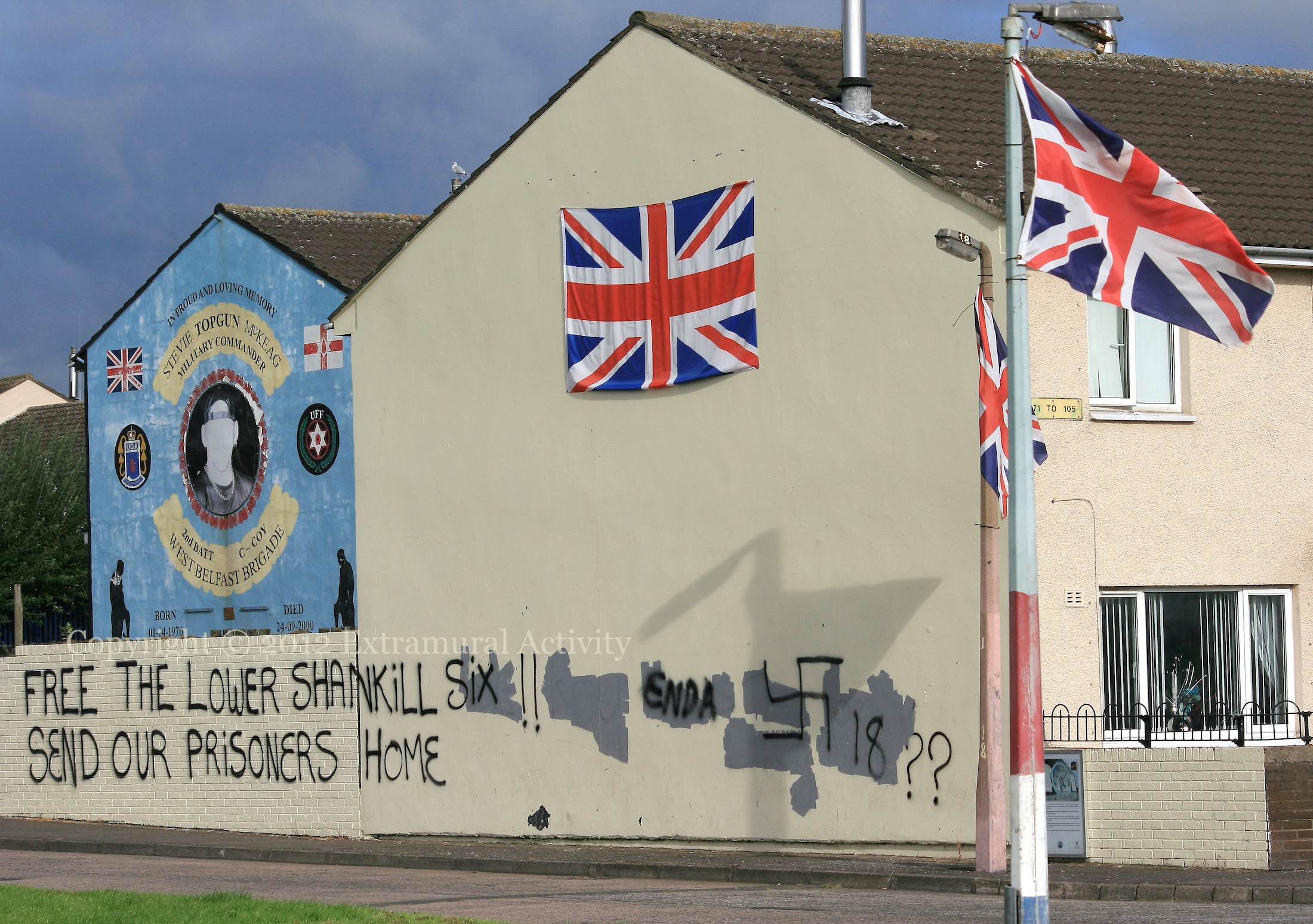 Here are two details of a large board on the Shankill celebrating the Queen’s diamond jubilee. Still no firm rules for the main Covenant march this coming Saturday … (BBC | Slugger)