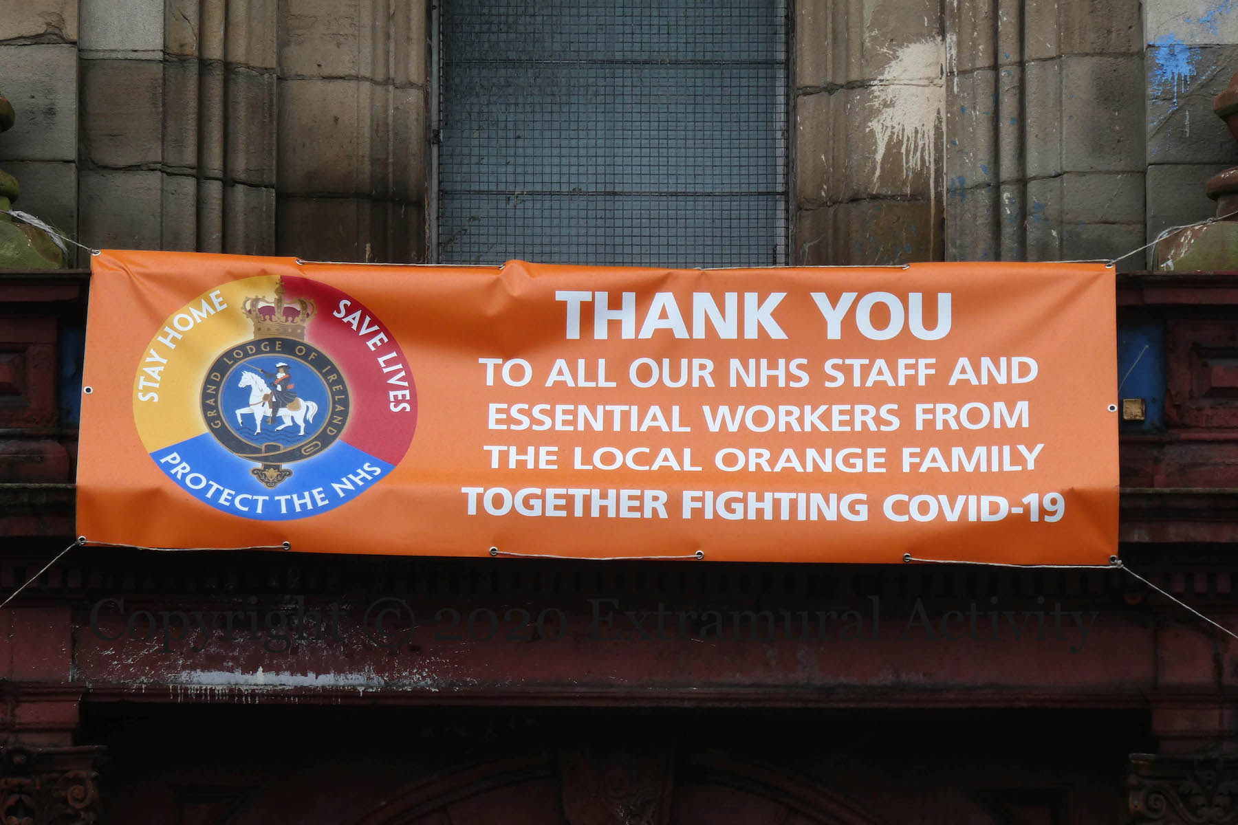 “Pro tanto quid retribuamus” [What shall we give in return for so much] is the motto of Belfast, included in the coat of arms shown above and newly appropriate in the coronavirus pandemic. “Thank you to all our NHS staff and essential workers from the local Orange family. Together fighting Covid-19.” The banner is on the Clifton Street hall; King William III bestrides his horse and the horse bestrides the building.