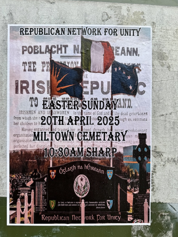 Each republican group has its own commemoration(s) of the 1916 Easter Rising. (For a list of this year’s commemorative marches, see Republican News.) This is a poster for the RNU’s ceremony in Milltown on the morning of Easter Sunday.