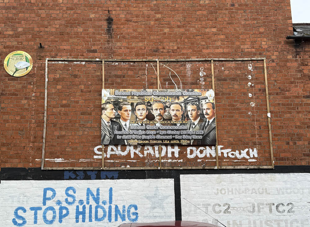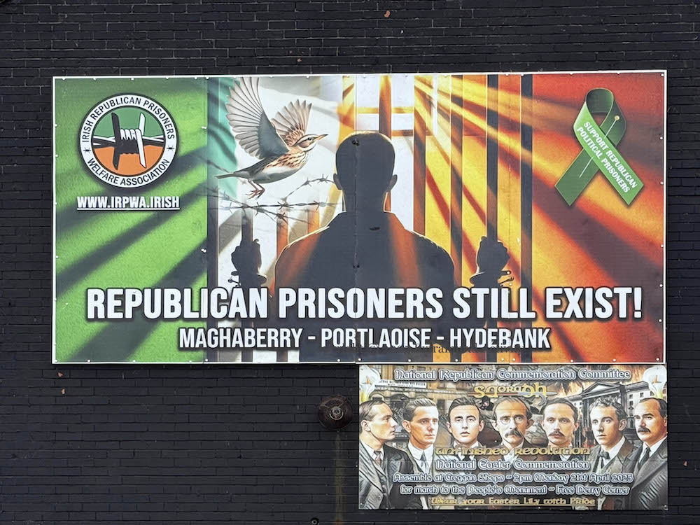 “Support republican political prisoners” in “Maghaberry – Portlaoise – Hydebank”. IRPWA (web) board in Ardoyne Avenue, north Belfast. For a close-up of the Saoradh call to commemorate the Easter Rising, see the Paddy Duffy collection.