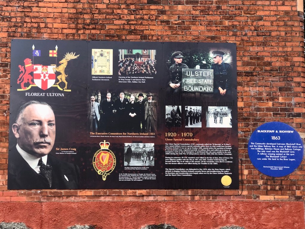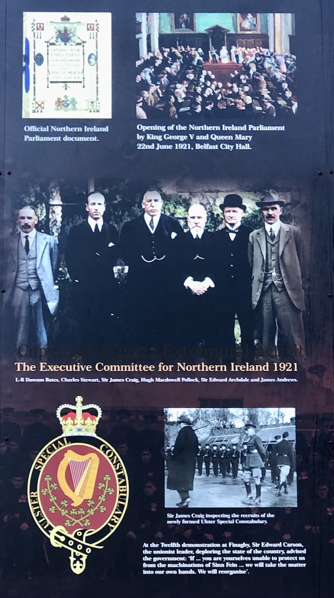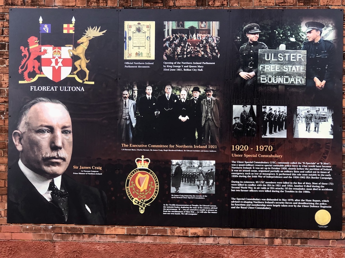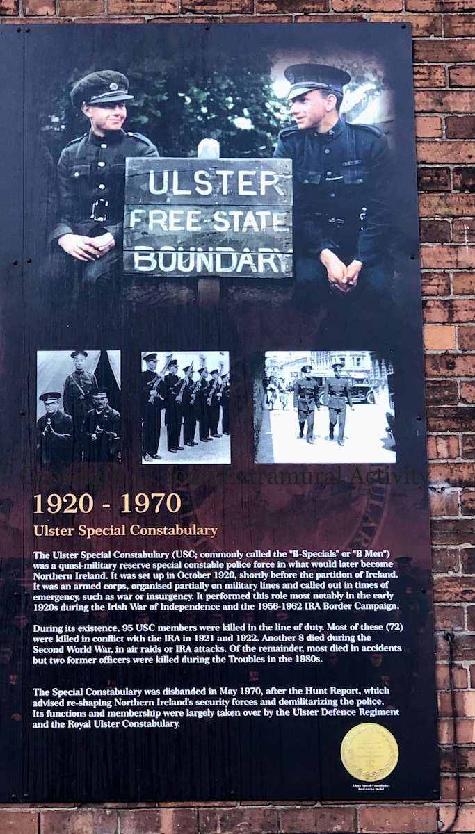 The text on the board is the same as at WP: “The Ulster Special Constabulary (USC; commonly called the “B-Specials” or “B Men”) was a quasi-military reserve special constable police force in what would later become Northern Ireland. It was set up in October 1920, shortly before the partition of Ireland. It was an armed corps, organised partially on military lines and called out in times of emergency, such as war or insurgency. It performed this role most notably in the early 1920s during the Irish War of Independence and the 1956-1962 IRA Border Campaign. During its existence, 95 USC members were killed in the line of duty. Most of these (72) were killed in conflict with the IRA in 1921 and 1922. Another 8 died during the Second World War, in air raids or IRA attacks. Of the remainder, most died in accidents but two former officers were killed during the Troubles in the 1980s. The Special Constabulary was disbanded in May 1970, after the Hunt Report, which advised re-shaping Northern Ireland’s security forces and demilitarizing the police. Its functions and membership were largely taken over by the Ulster Defence Regiment and the Royal Ulster Constabulary.”