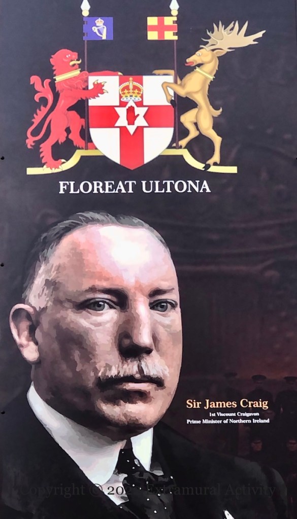 “May Ulster flourish” as the newly created Northern Ireland under “Sir James Craig, 1st Viscount Craigavon, Prime Minister of Northern Ireland”. The Northern Ireland parliament was opened in 1921 and the coat of arms adopted in 1924 (WP); the Special Constabulary (including the B-Specials) had been formed prior to and in preparation for partition – the quote from Carson (also seen in an east Belfast mural) is from July 12th, 1920.