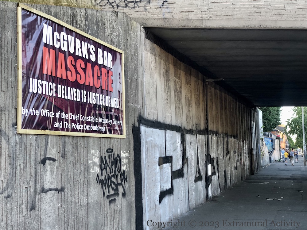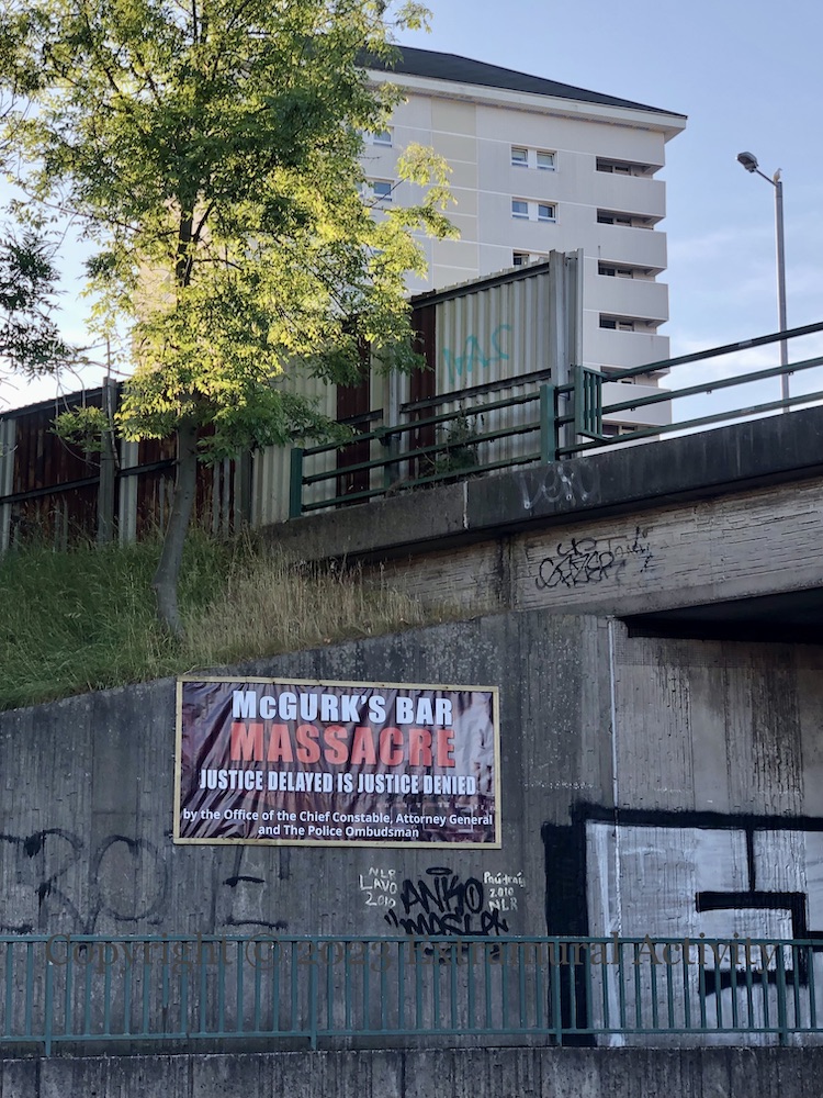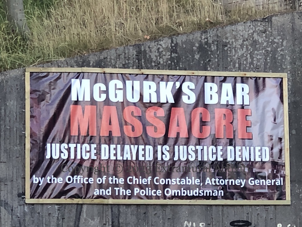“Justice delayed is justice denied by the Office of the Chief Constable, Attorney General and The Police Ombudsman.” McGurk’s bar was bombed in December, 1971, causing the death of 15 people. At the time, the security forces maintained that the bomb was left by someone from the IRA for later collection and that the pub was affiliated with the IRA, despite the fact that a loyalist group claimed responsibility and a witness saw the bomb being planted a few moments before it went off. Among those repeating the “own goal” story was Brigadier Frank Kitson (McGurk’s Bar twitter | BelTel), who was recently named in a Derry mural in connection with Bloody Sunday – see From The Top Down.