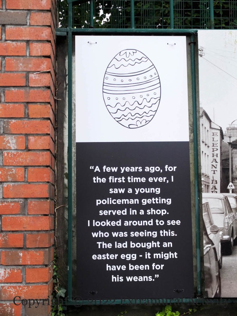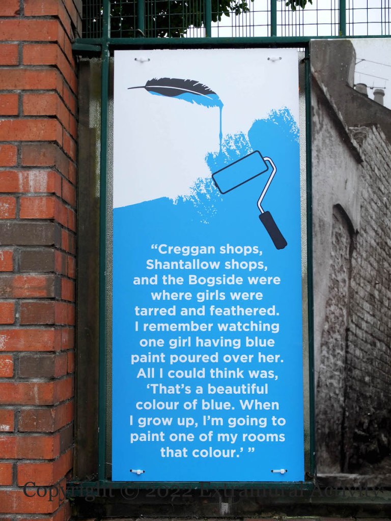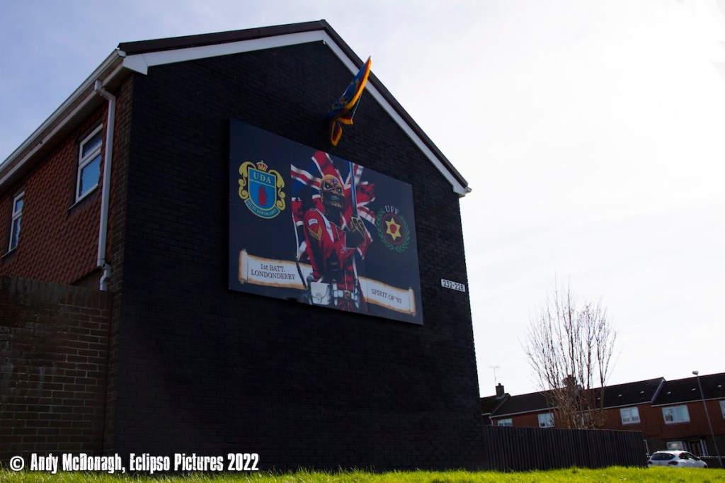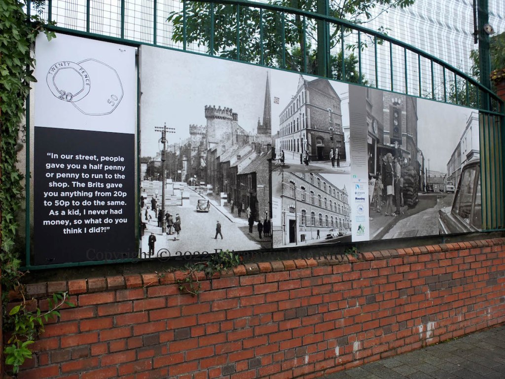 Here is a 12-part history of Northern Ireland (and specifically Londonderry) along the length of Sperrin Park in the Caw. After the title panel, the topics are: King George V opens Norther Ireland Parliament, 22nd June, 1921; Amelia Earhart crosses the Atlantic & lands in Londonderry 21st May, 1932; Operation Deadlight: surrender of German U-boats at Lisahally 14th May, 1945; Queen Elizabeth II visits Guildhall Sq. Londonderry 3rd July, 1951; opening of Altnagelvin hospital 1st February, 1960; the exodus of people from Londonderry’s Cityside 1970s; Northern Ireland reach the World Cup finals in Spain 1982; first Maiden City Festival takes place August, 1998; end of ‘Operation Banner’ 31st July, 2007; Londonderry named first UK City Of Culture 2013; Prince Philip the Duke Of Edinburgh 1921-2021.