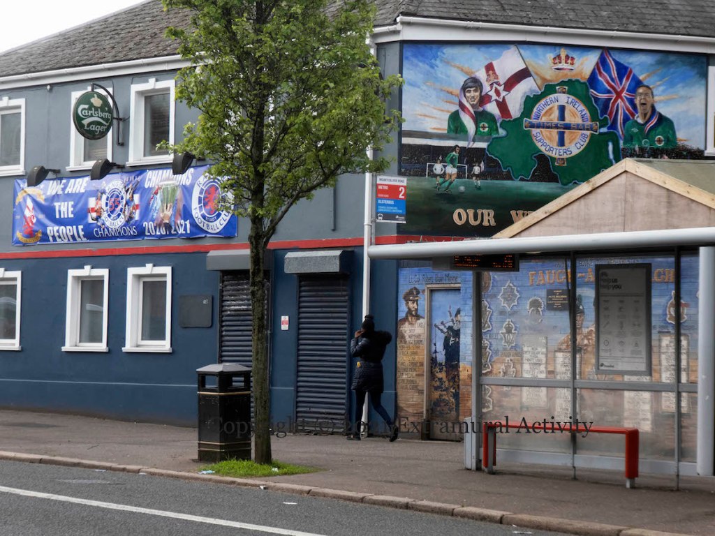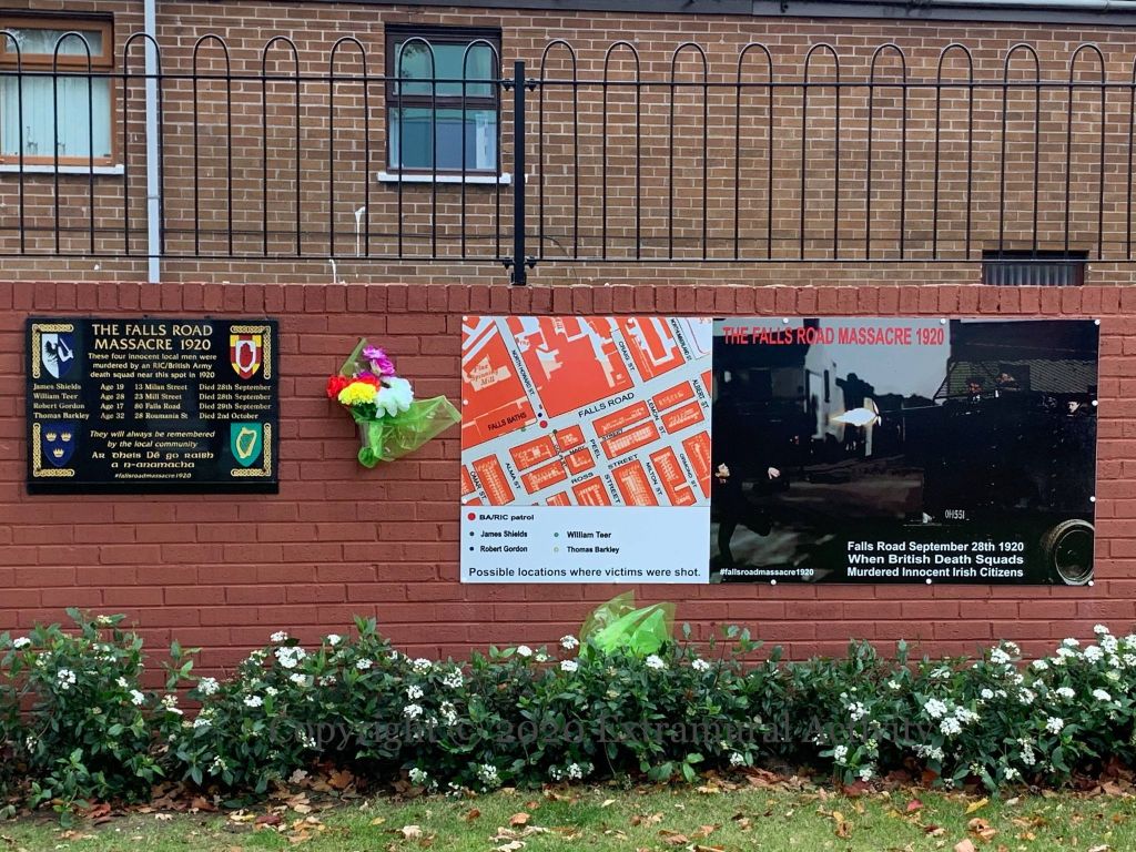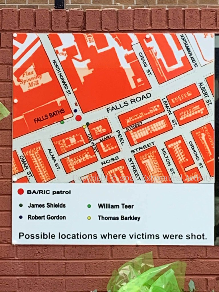 “The young and the old rallied around/To help fight the forces of the British crown/Unsung heroes too many to name/Defended Unity flats and never sought fame”. Unity flats were built in 1968 to replace the old Carrick Hill but immediately came under repeated attack by loyalists from the nearby Peter’s Hill and Shankill; by 1987 their demolition had been approved but because of difficulty in rehousing residents (Hansard), the new Carrick Hill was not completed until 2009 (BelTel). The flats have a Facebook page, Growing Up In Unity Flats. The plaques shown today are on the side of the newsagents in the new Carrick Hill.