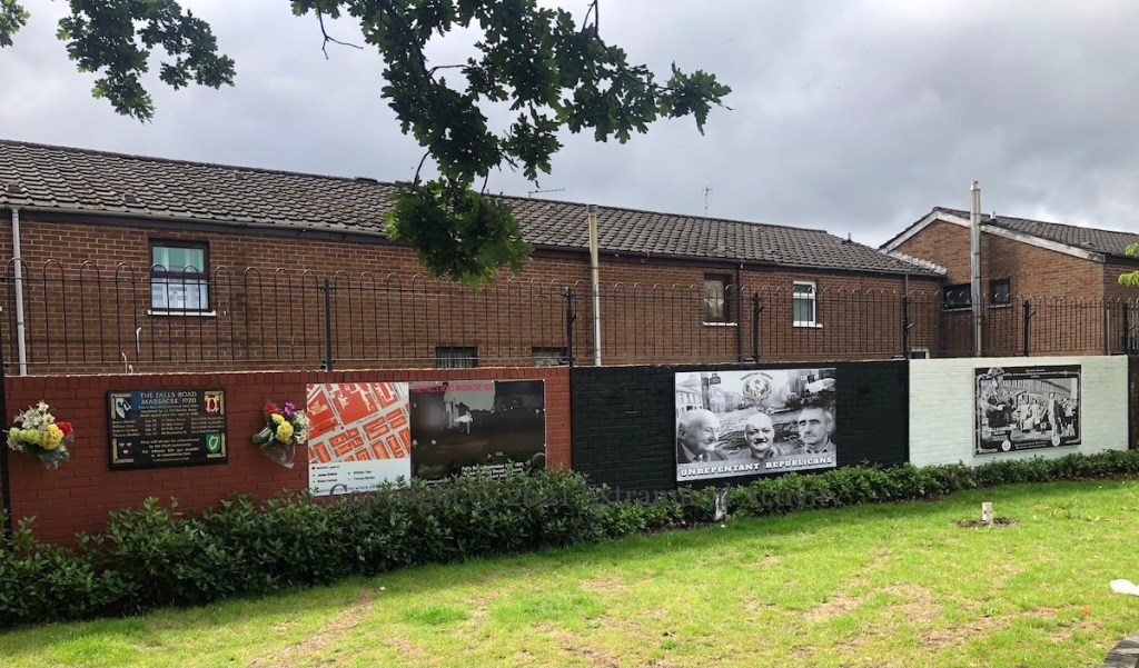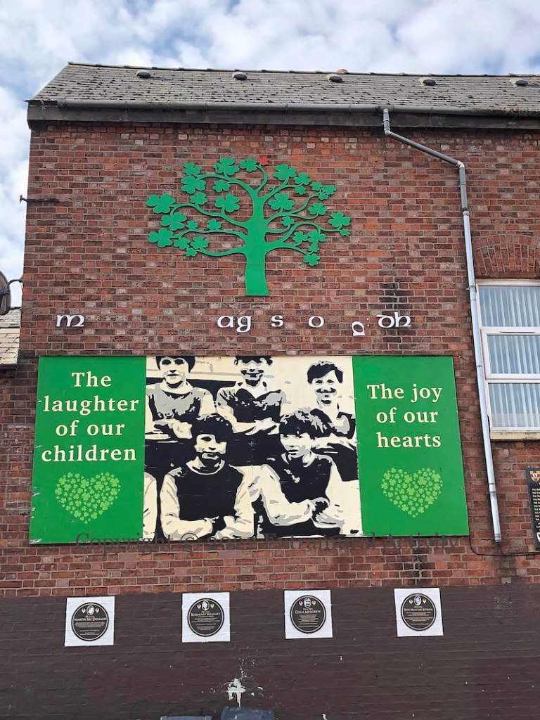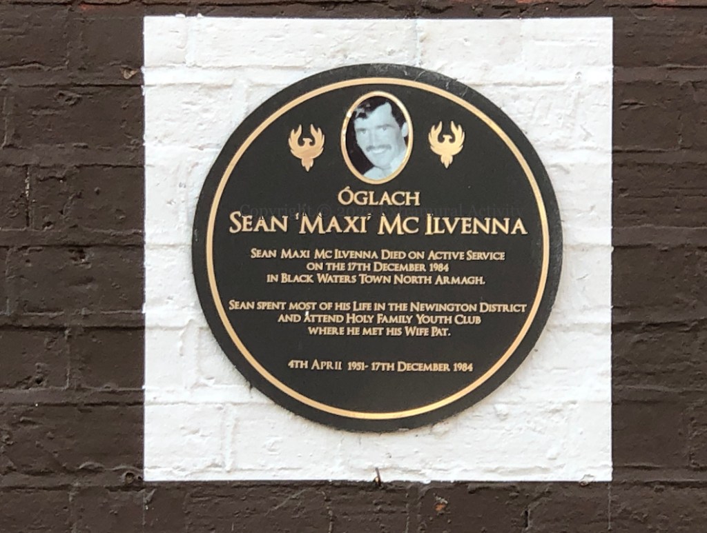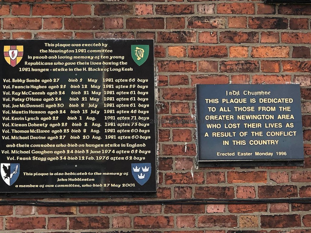 The Newington tribute to Bobby Sands and the other deceased hunger strikers of the 1970s and 80s (see previously: Mol An Óıge Agus Tıocfaıdh Sí) has been augmented with four plaques to republicans from the area who died in the Troubles: (l-r) Martin McDonagh, Rosemary Bleakley, Colm Mulgrew, and Sean ‘Maxi’ McIvenna.