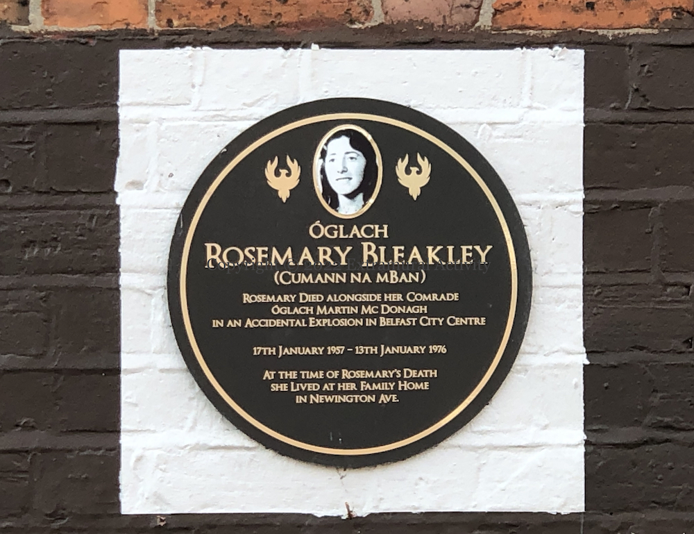 Unbeknowst to her parents (Lost Lives), Bleakley had joined Cumann Na mBan at 18 and was four days short of her nineteenth birthday when she and McDonagh were killed in a premature bomb explosion in the North Street arcade (Victor Patterson image of the blast), along with civilians Ian Gallagher and Mary Dornan (Sutton); 20 others were injured (Fortnight). Bleakley was not buried in the republican plot (in Milltown) but coincidentally in the plot adjacent to Dornan (BBC).