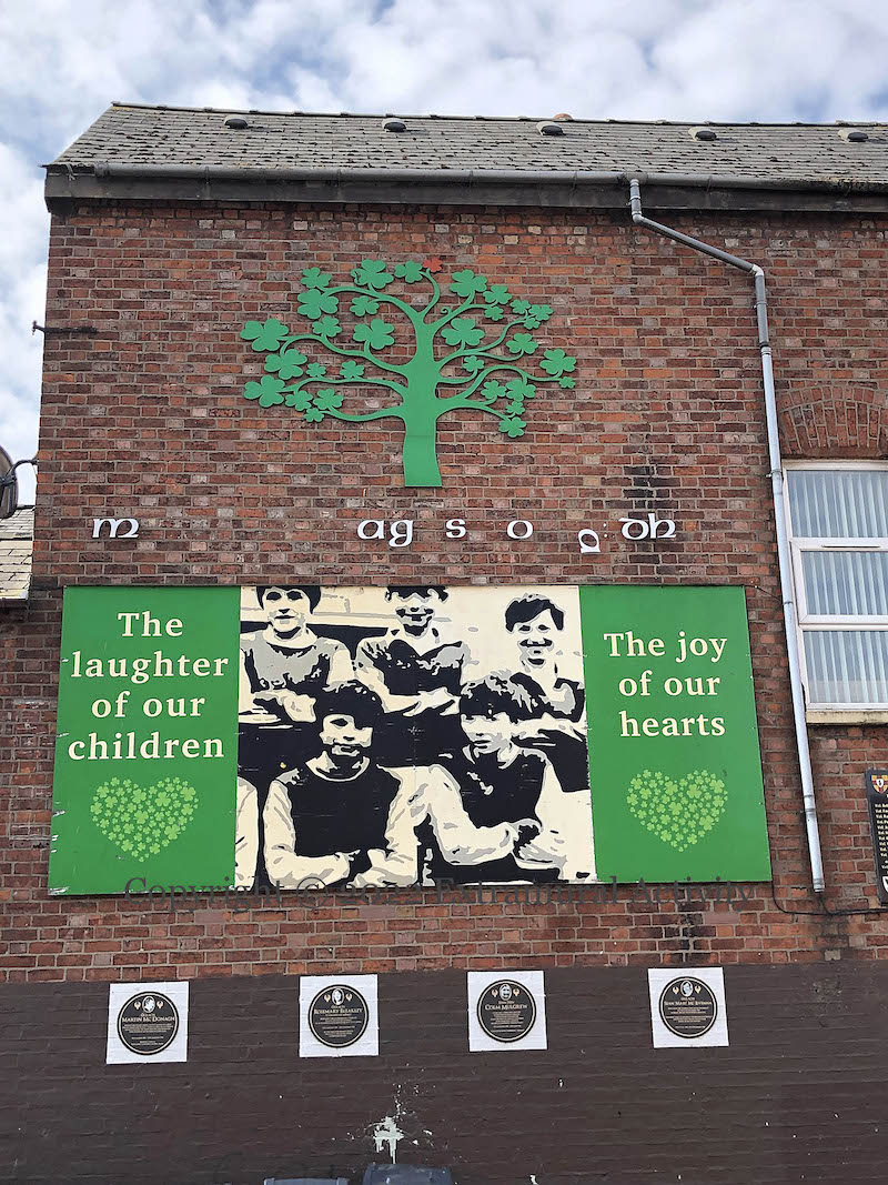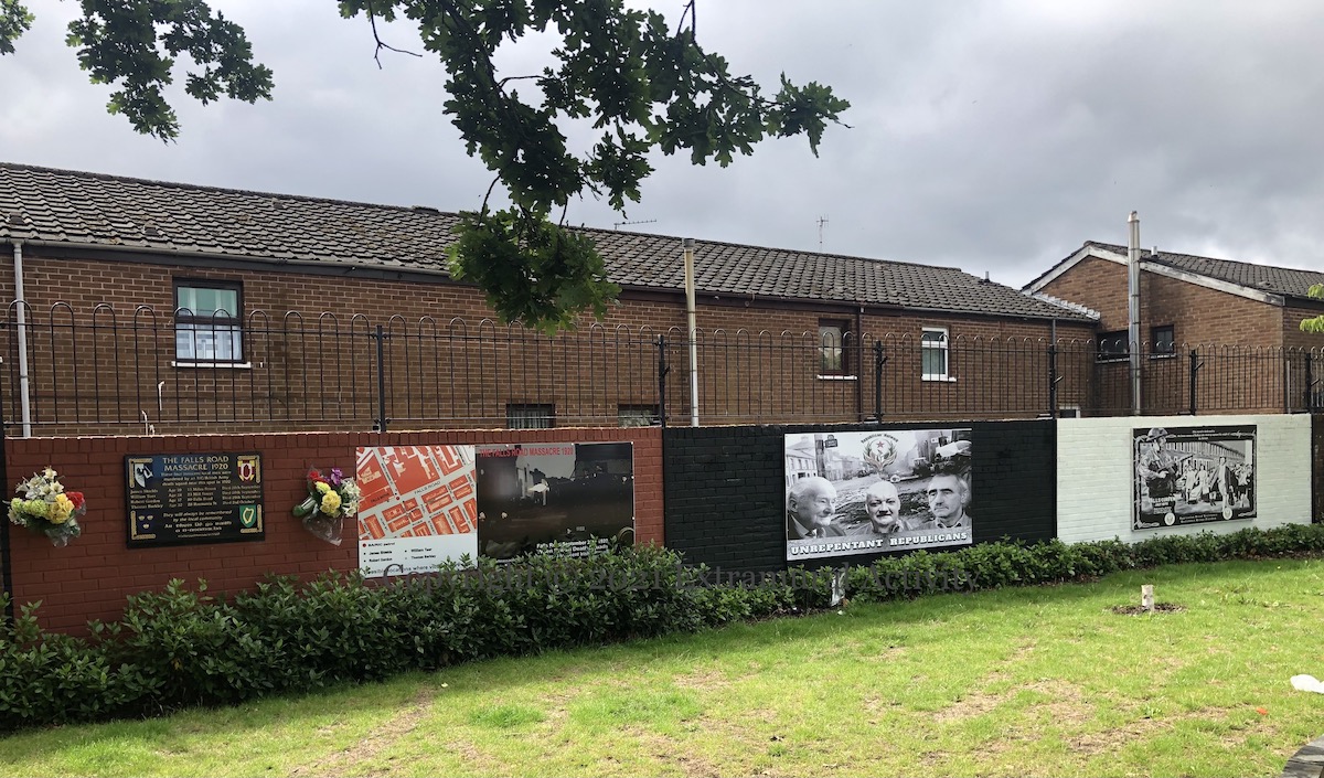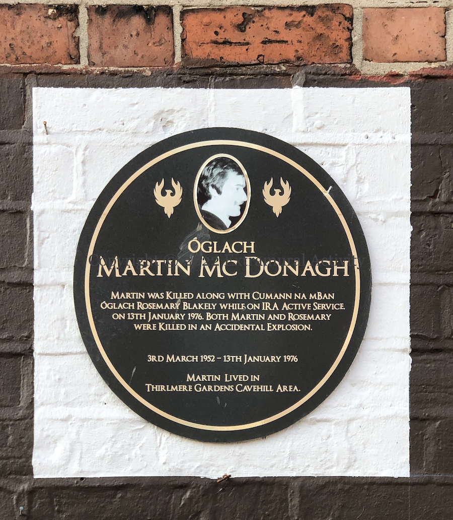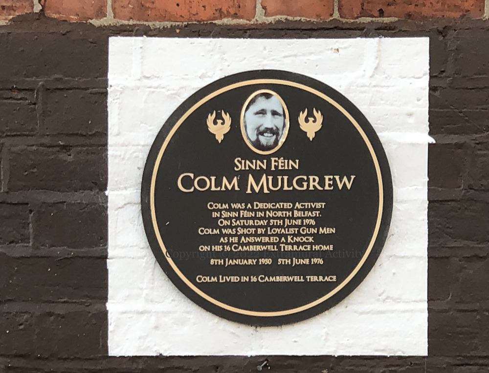 The Newington tribute to Bobby Sands and the other deceased hunger strikers of the 1970s and 80s (see previously: Mol An Óıge Agus Tıocfaıdh Sí) has been augmented with four plaques to republicans from the area who died in the Troubles: (l-r) Martin McDonagh, Rosemary Bleakley, Colm Mulgrew, and Sean ‘Maxi’ McIvenna.