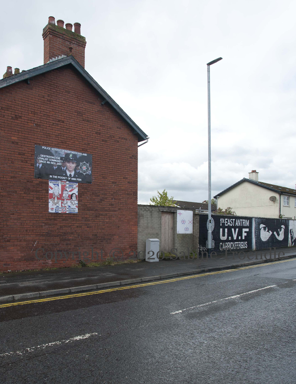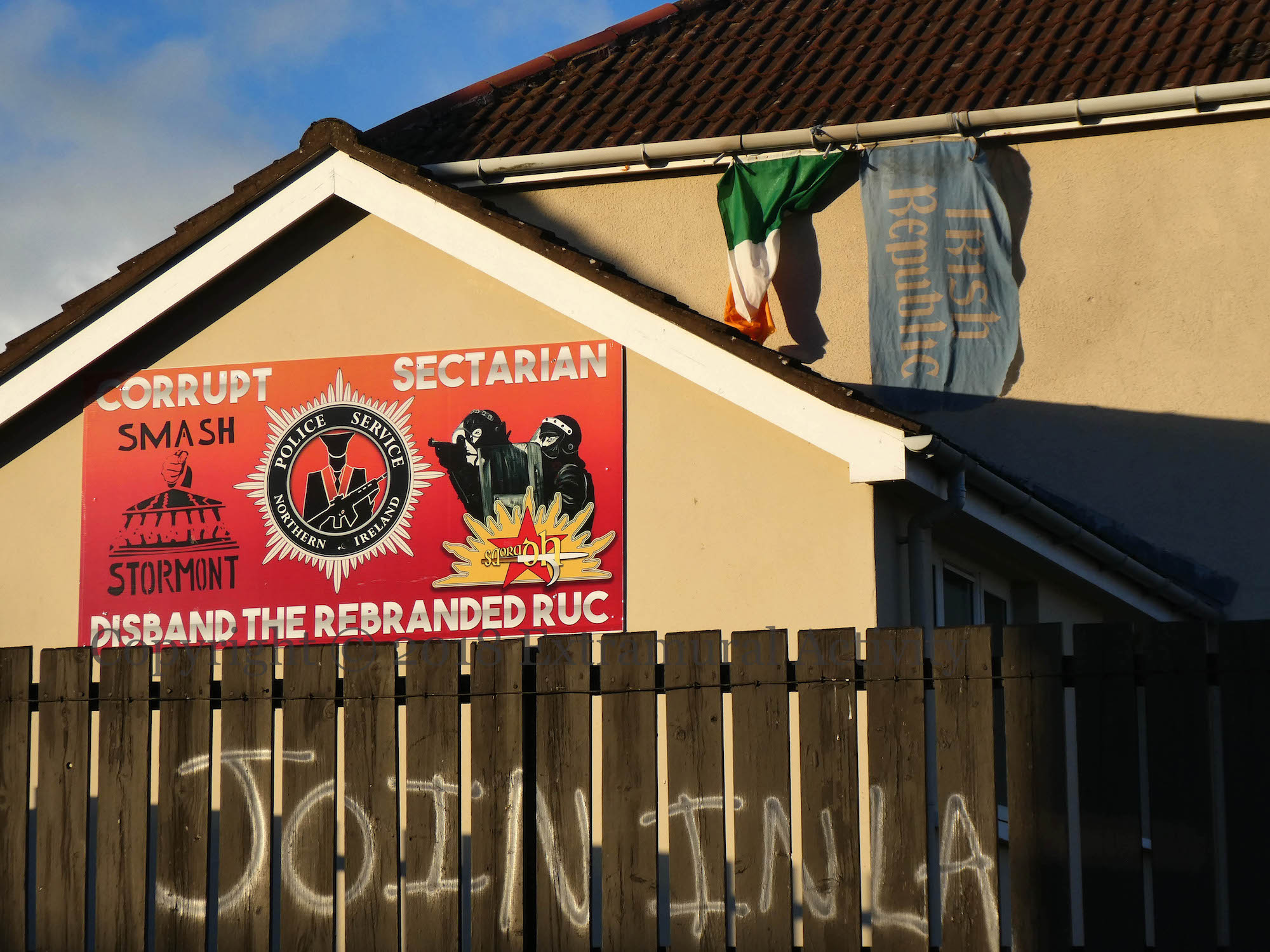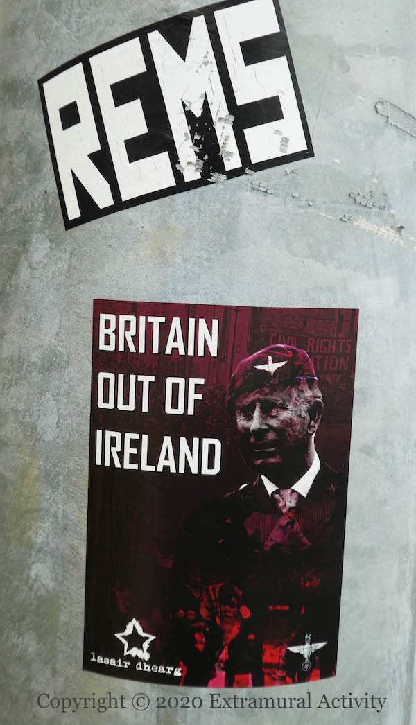“PSNI Out” is the latest message on Slıabh Dubh from Gael Force Art, mounted in response to what it sees as disparate treatment of nationalists on the one hand (intruding, ostensibly on Covid-related grounds, interfering with a flower-laying ceremony in commemoration of the attack on the Sean Graham bookies shop on the Ormeau Road (Feb 5th, 1992) and arresting one of the victims, Mark Sykes (RTÉ)) and unionists on the other (PSNI monitoring but not confronting a UVF show of strength in Pitt Park (iTV)).