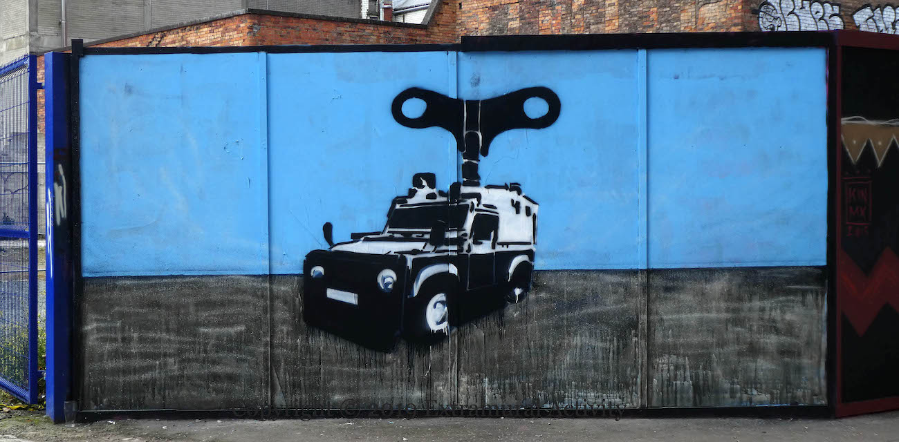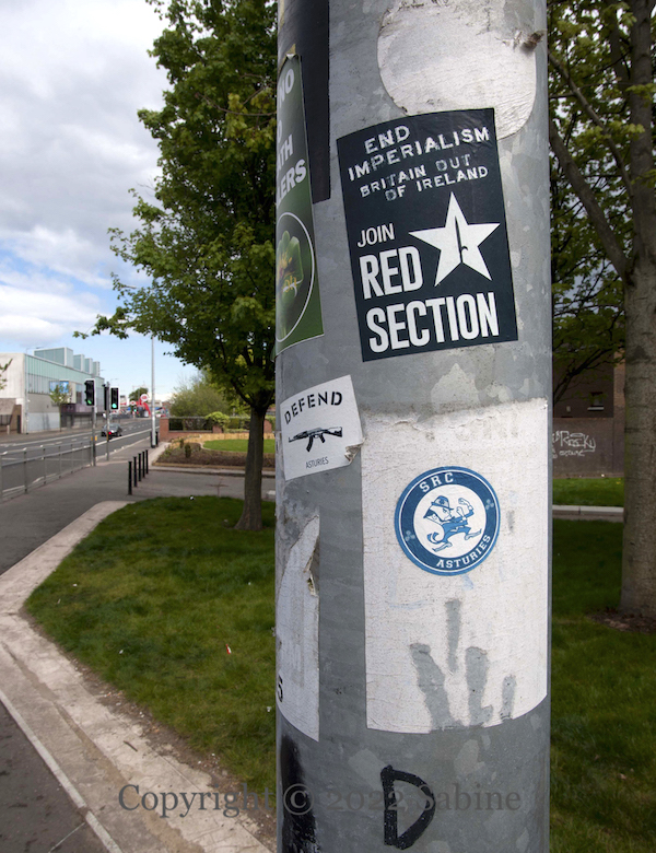Michelle O’Neill called the Ormeau incident “a watershed moment for public confidence in policing” (Irish News); one officer has been suspended. The writing on the mountain is seen here over the Captain America panel of the wall of superheroes, enhanced versions of their human alter egos: Steve Rogers, Bruce Banner, Clark Kent, etc.