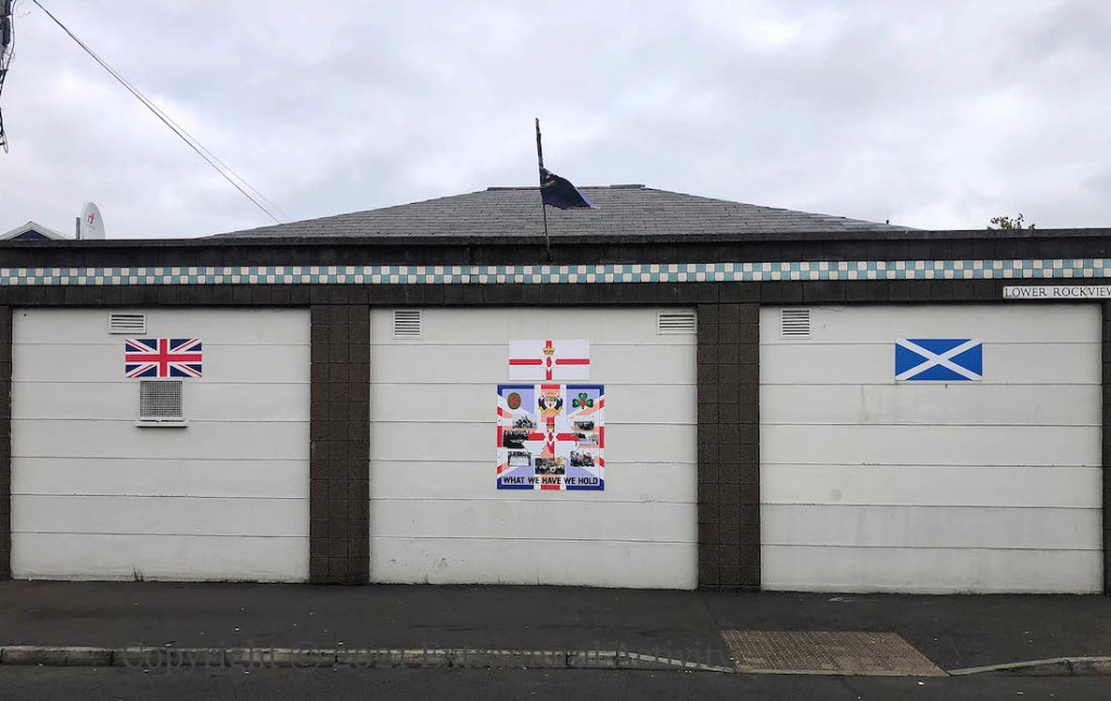 Here is an article from TheJ.ca interviewing PUL politicians on their support for Israel and an Irish News article revisiting the issue in light of the current conflict. And loyalists have previously (since 2002? Irish Times | OU) flown the flag of Israel — see Gregg & Carson (2011) | View From The North Bank (2012) | The Young Conquerors (2013) | The United Nations (2014) | The Glorious Memory (2014) | Ulster Supports The People Of Israel (2018) | EU Hands Off Ulster (2021). But this is the first time that a symbol of violence has been used as the symbol of solidarity. (In republican muraling, see PLO-IRA (1982) | Women In Armed Struggle (1983).)