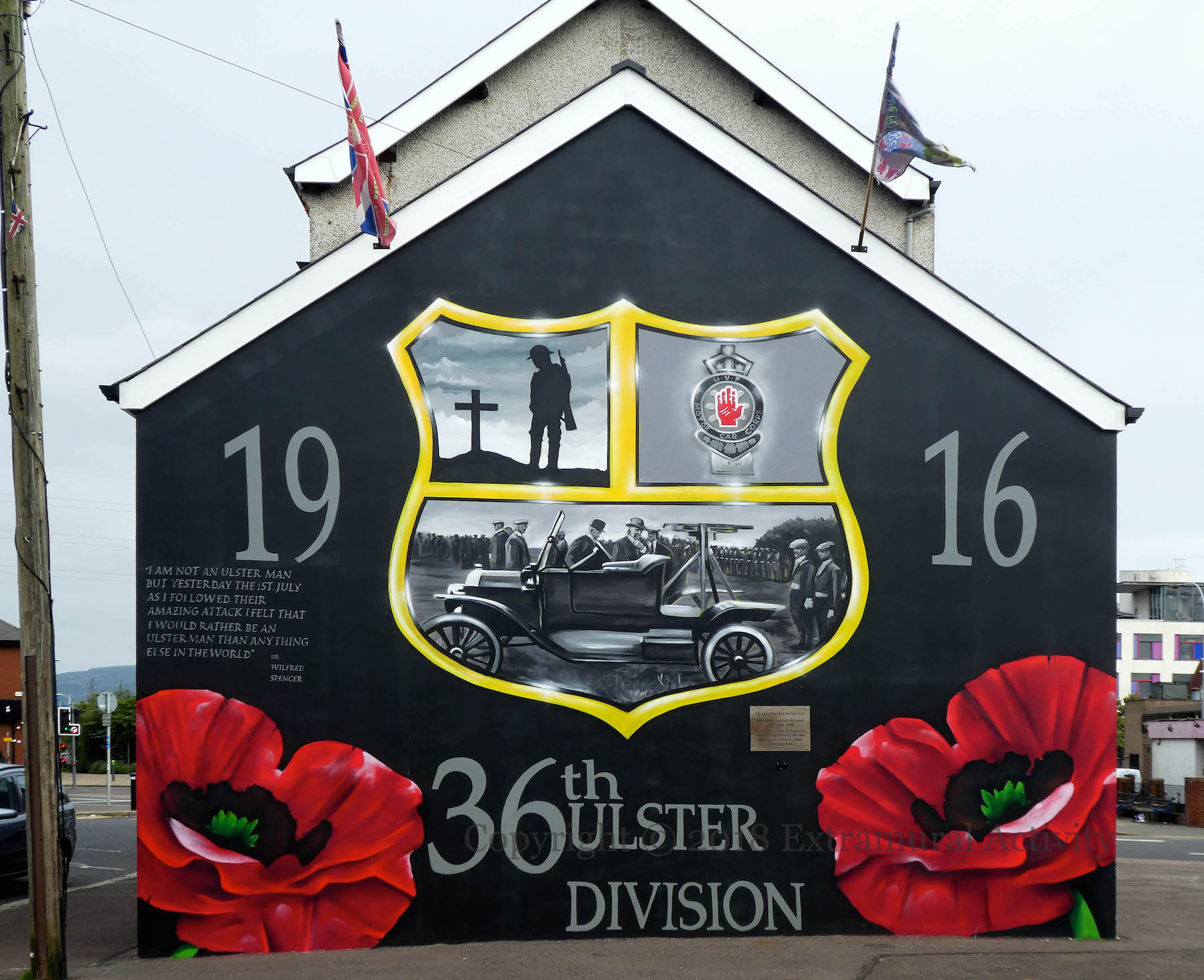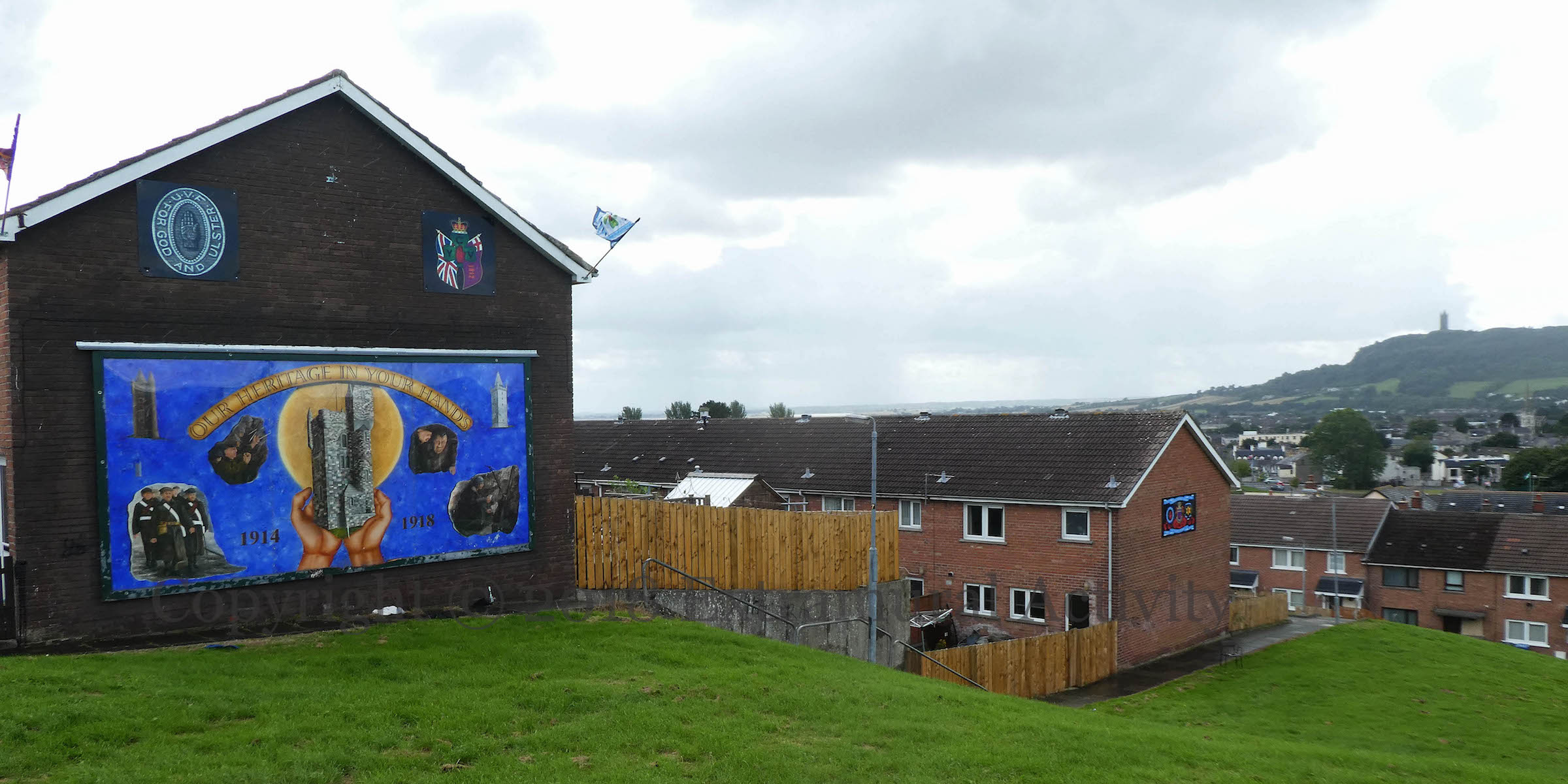 Edenderry bonfire standing tall on the site of the former Portadown railway station, with commemorative plaque to the Ulster Volunteers on the left-hand pillar.