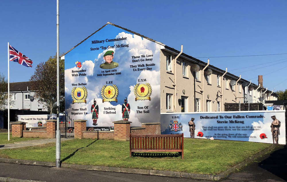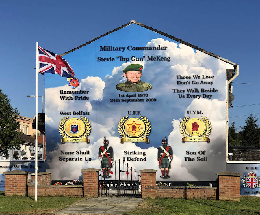 Stop The Boats has been painted out below the large “Loyalist Tiger’s Bay” and the entire wall painted in solid blue and book-ended by UDA and UFF boards showing silhouetted gunmen in active poses.