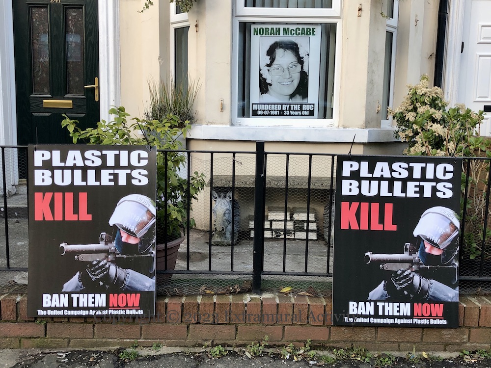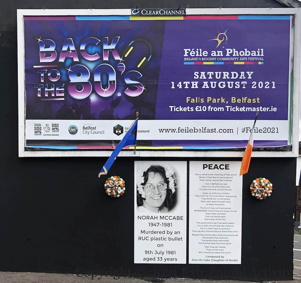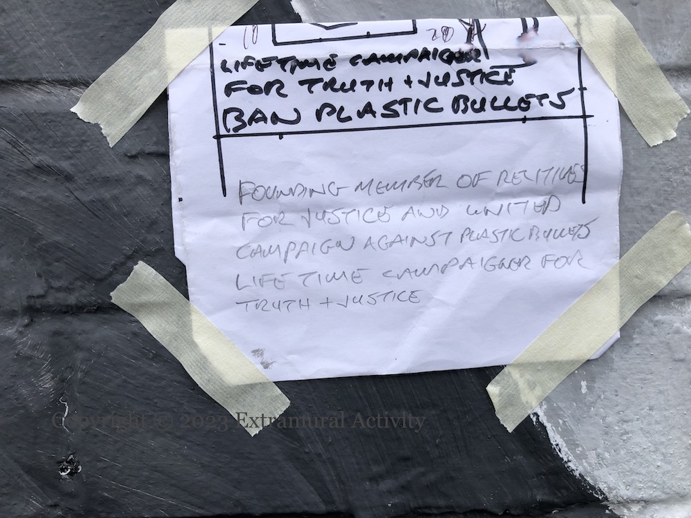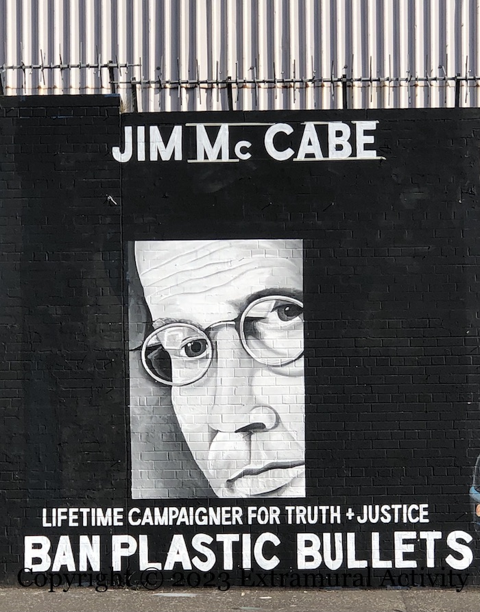 Jim McCabe, “life-long campaigner for truth and justice” after his wife Norah was killed by a plastic bullet in 1981, returns to the “International Wall” (Visual History) on Divis Street. The original mural – from a few months after his death in January 2023 – was replaced by A Window To A Free Country, one of the Palestinian-inspired murals. This new version replaces The Land Is Ours.