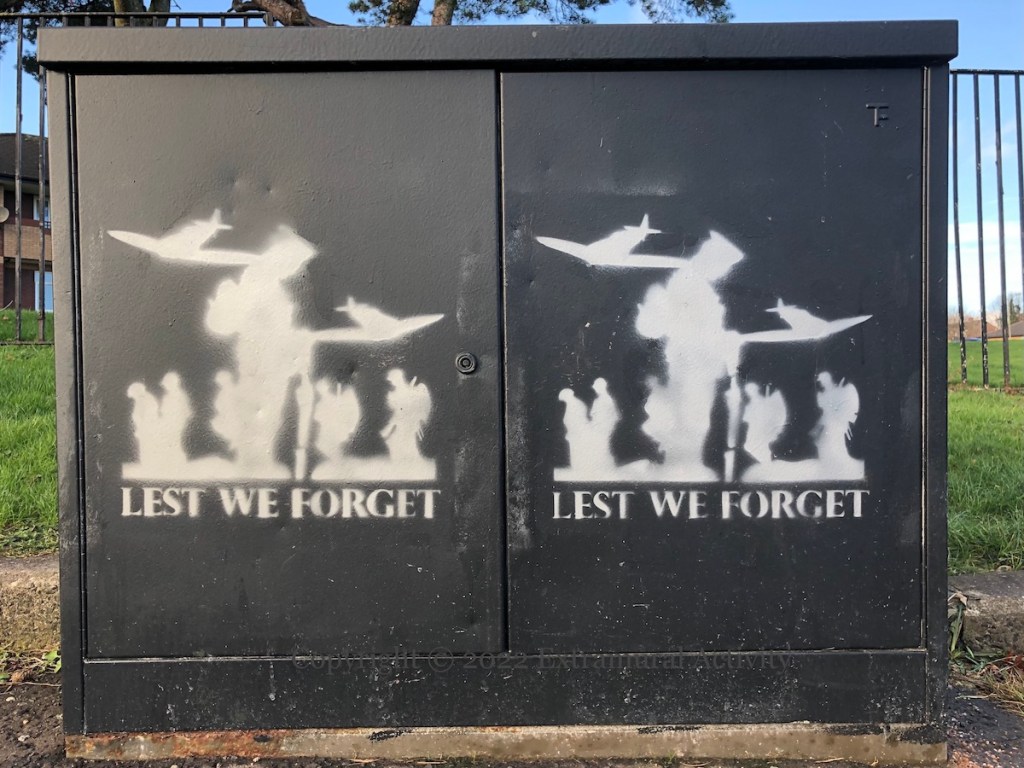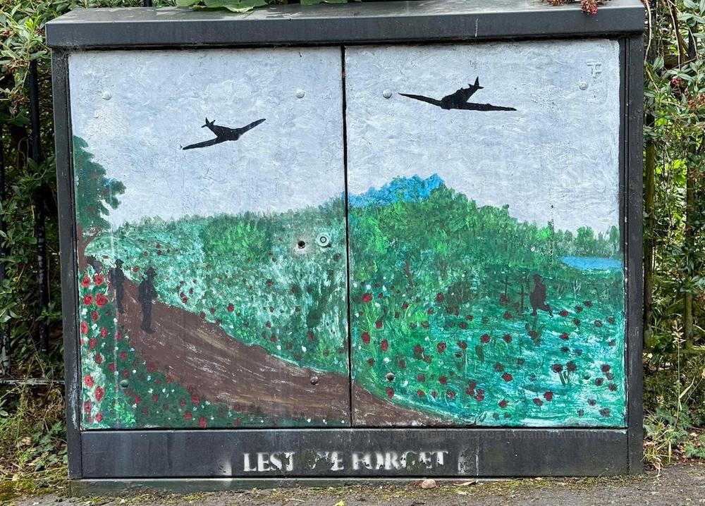 The stencil is perhaps not only a memorial to the dead of WWI – the planes appear to be WWII models such as the Hurricane or Spitfire on the electrical box (and in A Miracle of Deliverance); most WWI planes were biplanes.