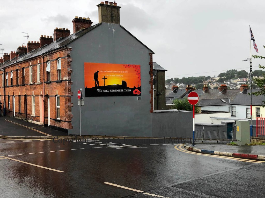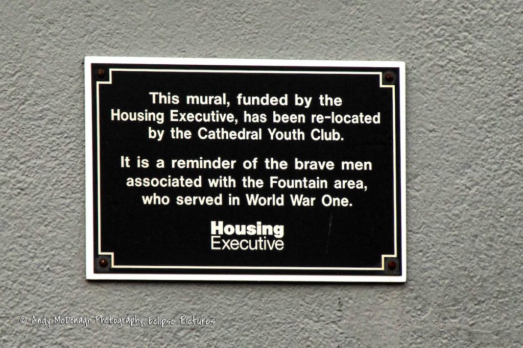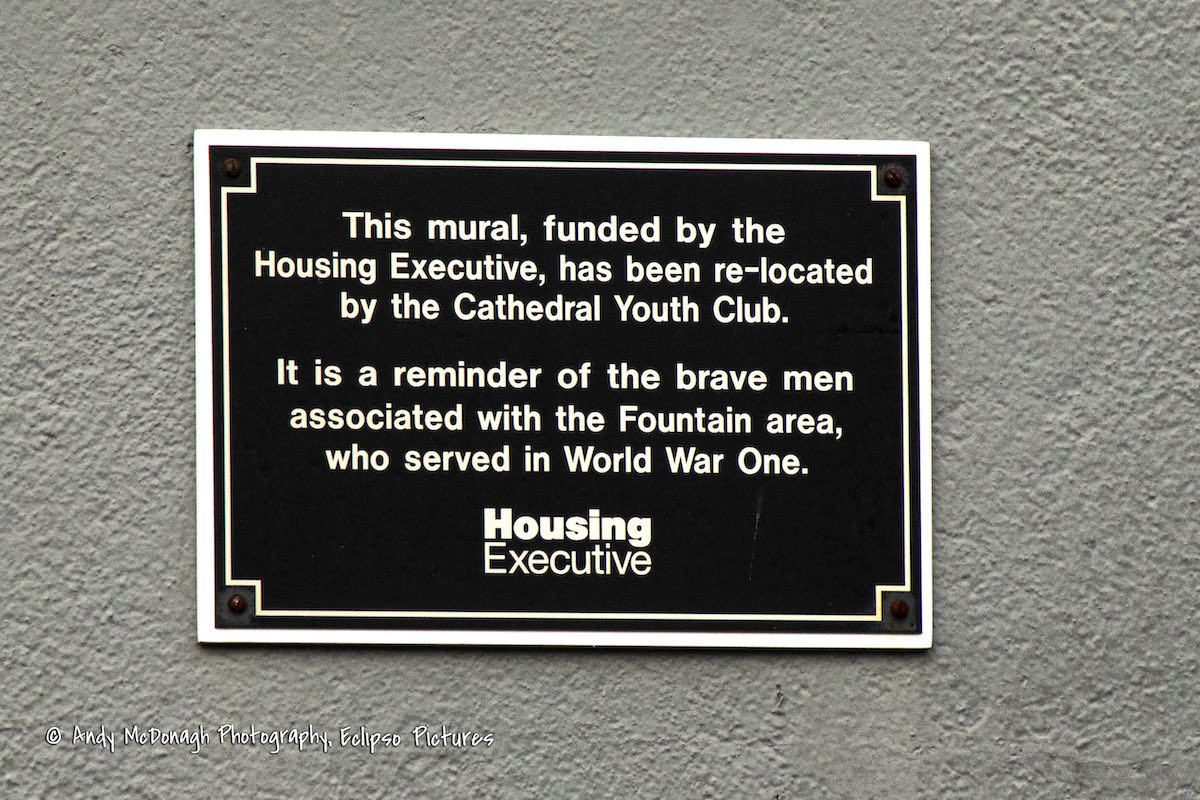 “At the going down of the sun and in the morning we will remember them.” “This mural, funded by the Housing Executive, has been re-located by the Cathedral Youth Club. It is a reminder of the brave men associated with the Fountain area, who served in World War One.”