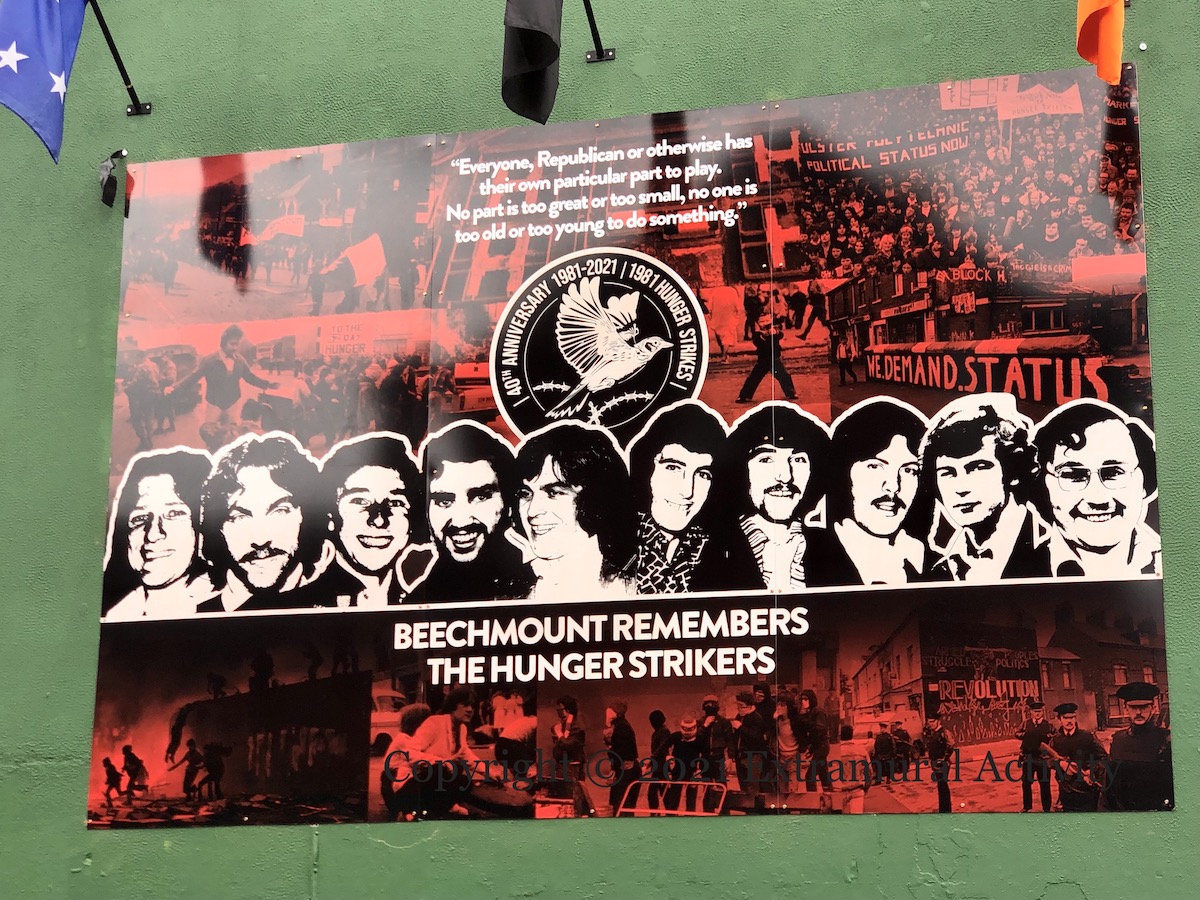 “Ní coırpıgh sınne! Éıreannaıgh sınne! [we are not criminals; we are Irish people] “There is that much to be done that no select or small portion of people can do; only the greater mass of the Irish nation will ensure the achievement of a socialist republic, and this can only be done by hard work and sacrifice.” – Bobby Sands [Hunger strike diary, March 14th, 1981]” With photographs of the ten deceased 1981 hunger strikers.