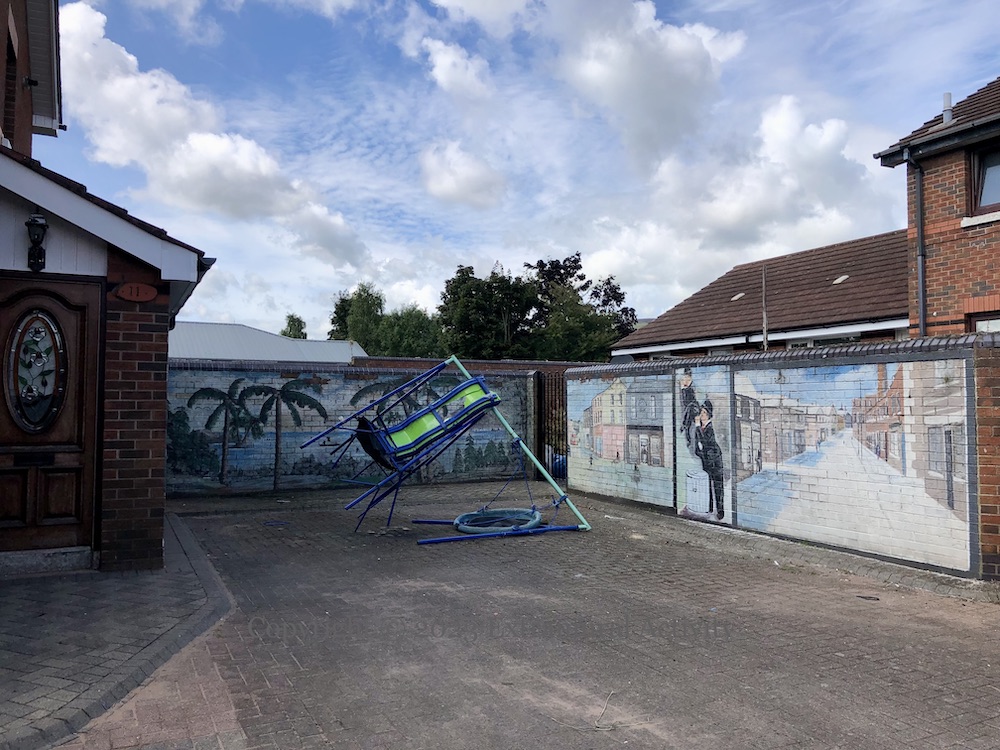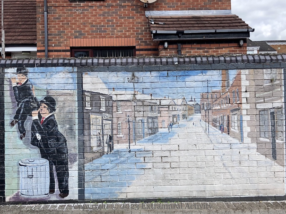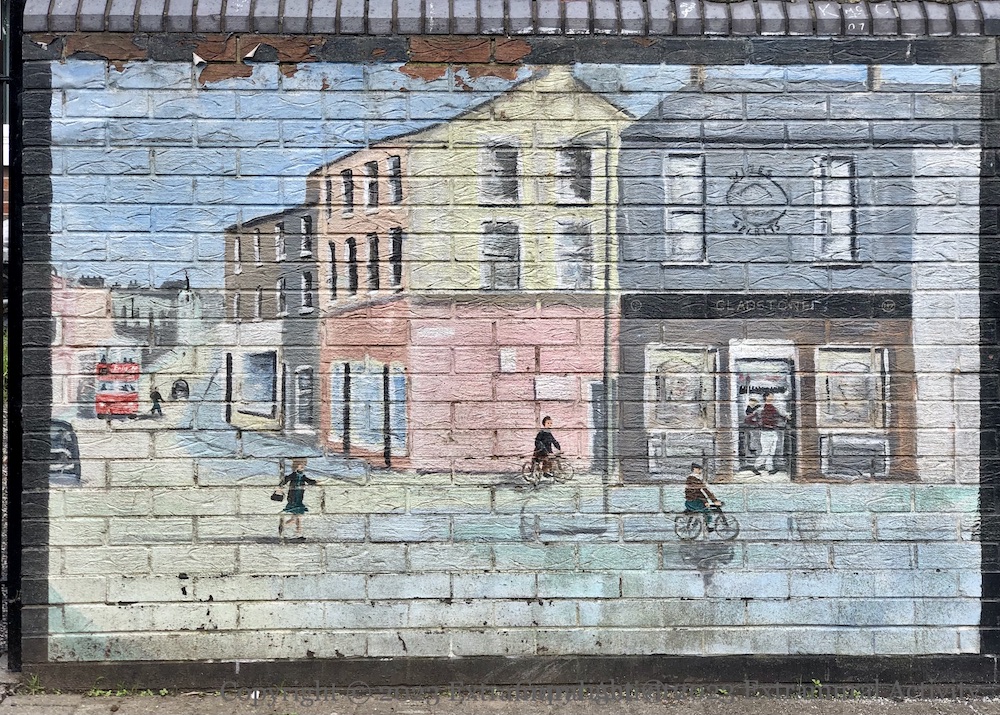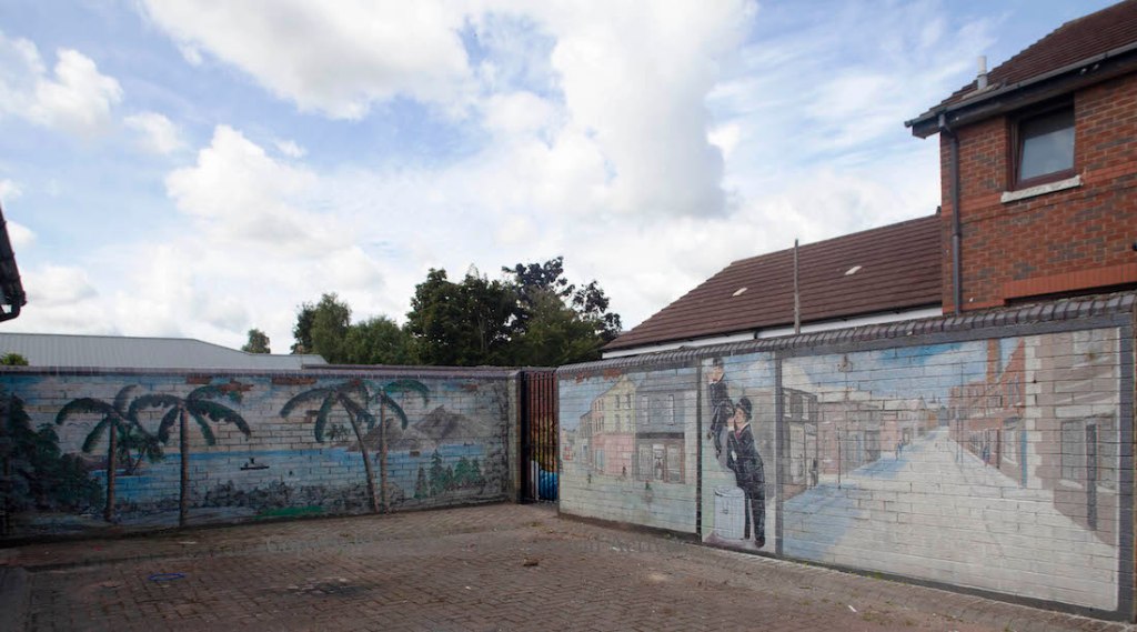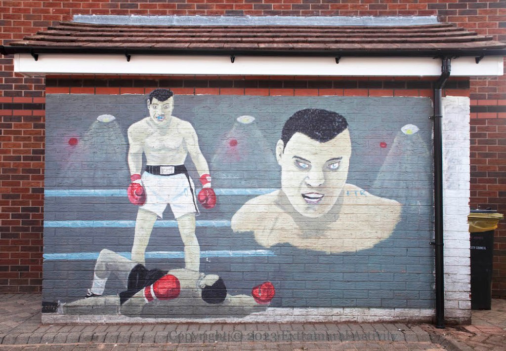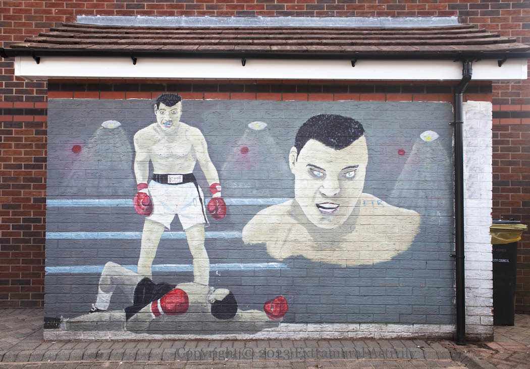 The murals are in a courtyard off Ross Road and were probably painted at the request of a local resident. The Ali-Liston fight – in 1965 – perhaps gives a date for the consciousness that groups all of these items together – the Gladstone was still standing in the 60s and Laurel and Hardy played on UK televisions into the 1970s. The source for the palm trees is unknown.