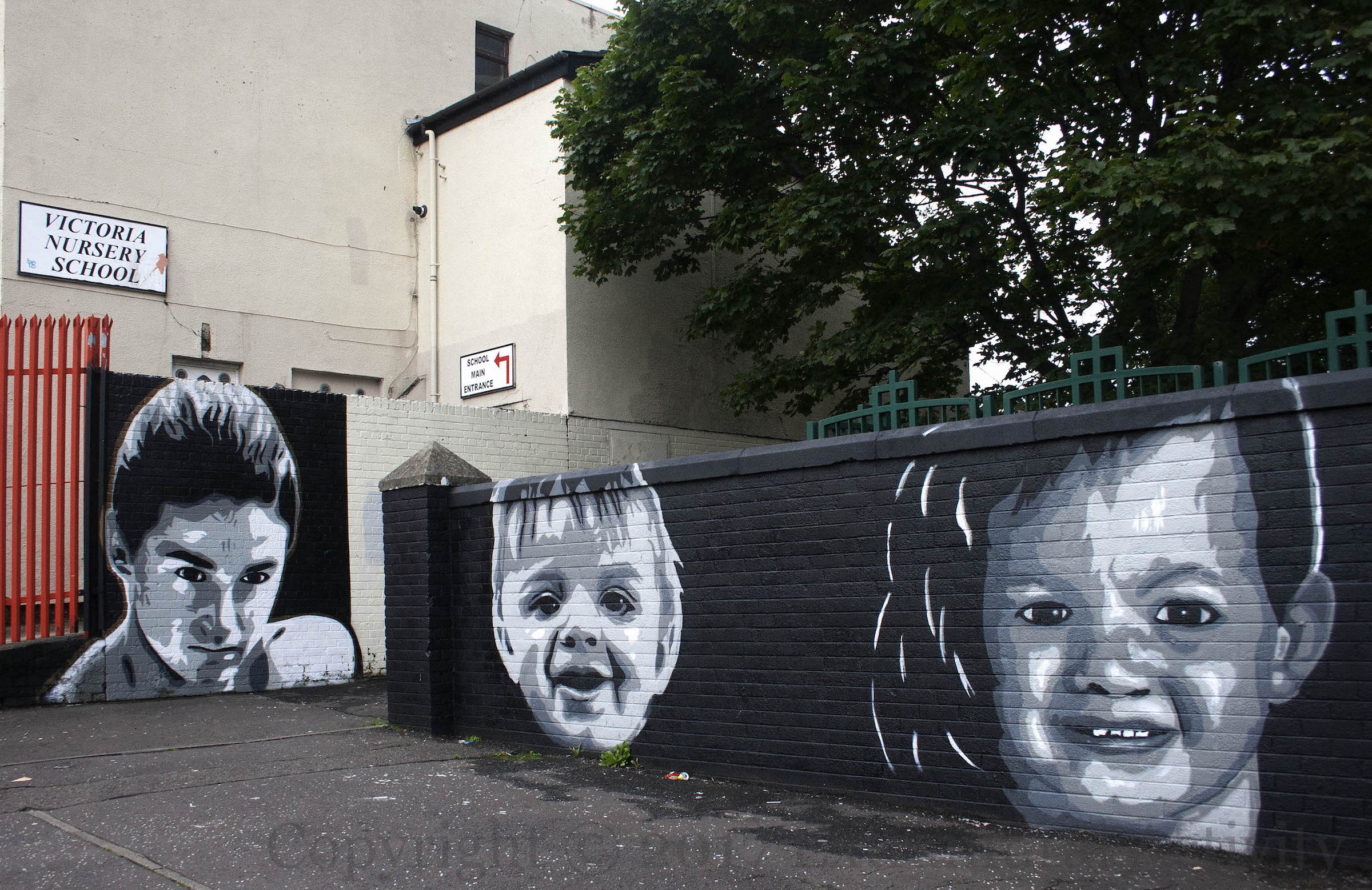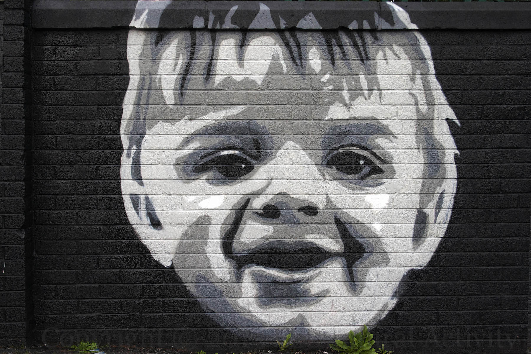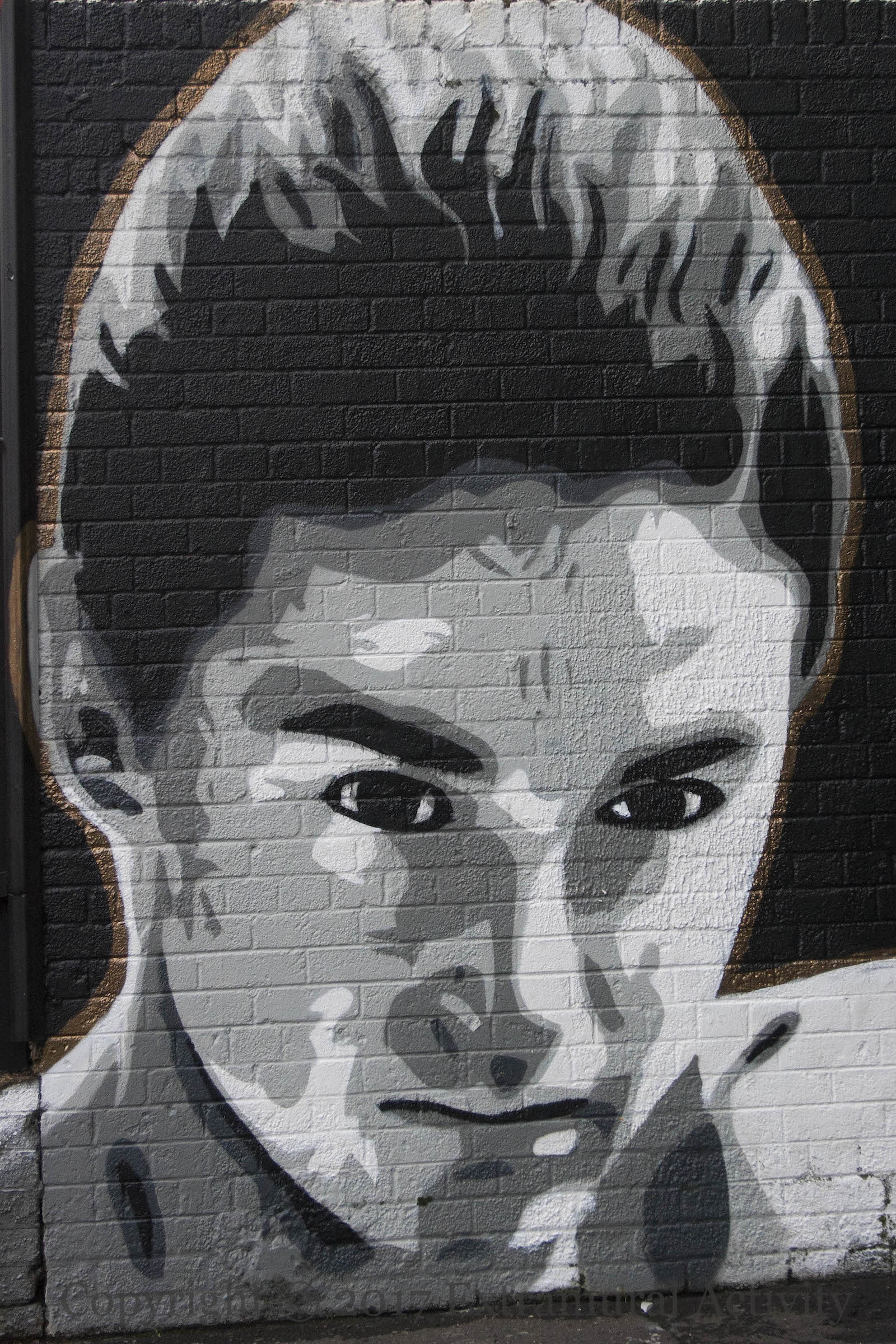 The murals are in a courtyard off Ross Road and were probably painted at the request of a local resident. The Ali-Liston fight – in 1965 – perhaps gives a date for the consciousness that groups all of these items together – the Gladstone was still standing in the 60s and Laurel and Hardy played on UK televisions into the 1970s. The source for the palm trees is unknown.