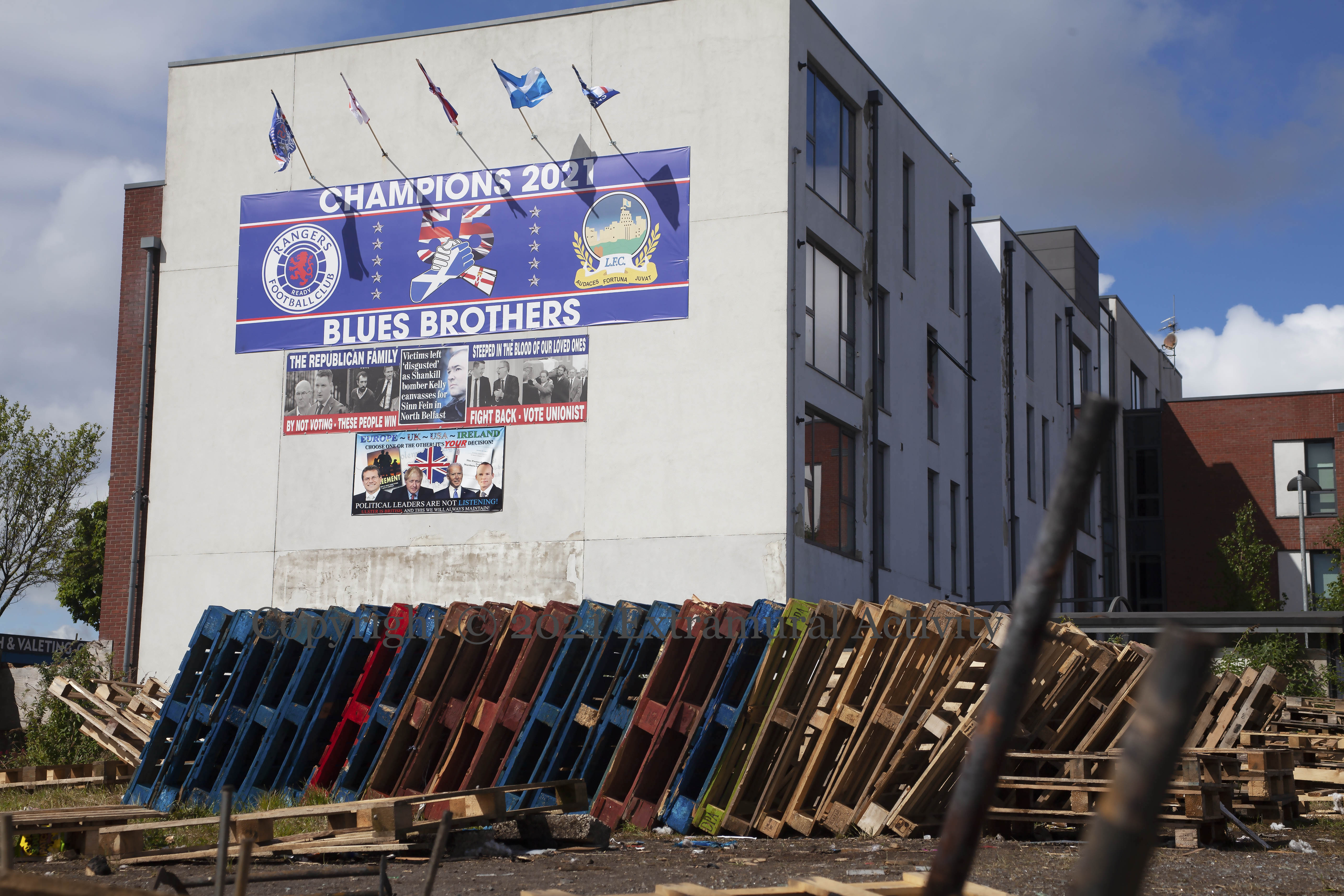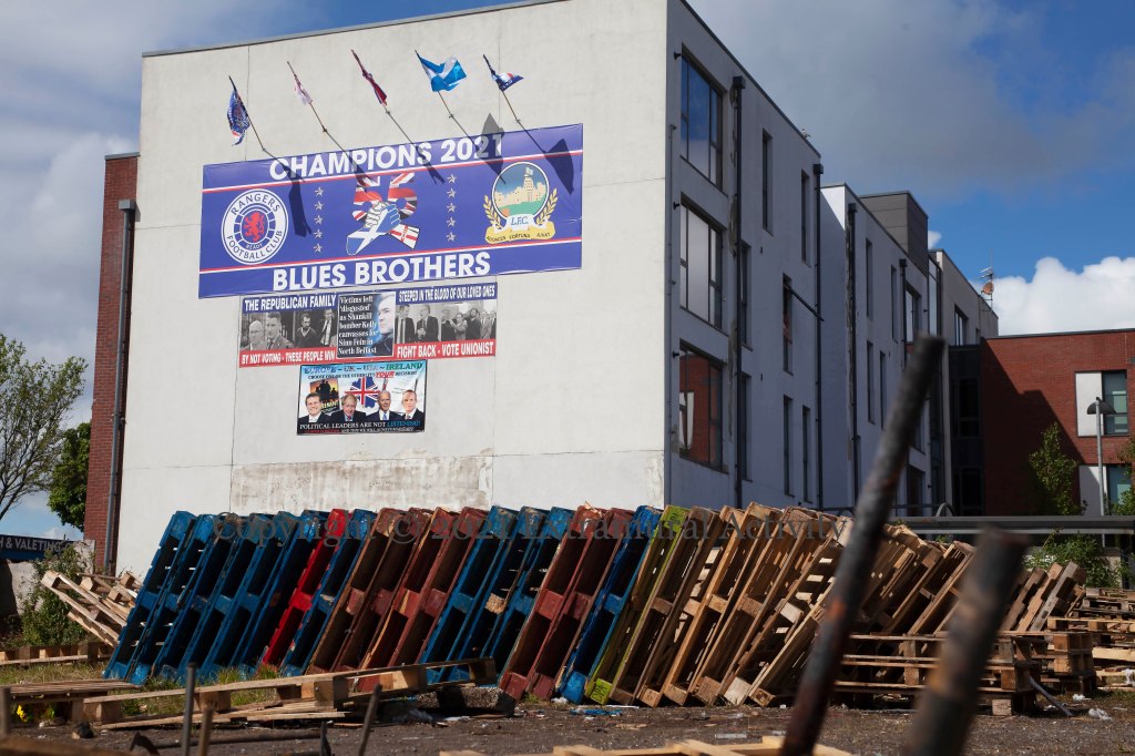 Local club Linfield are premier league champions for the 55th time, matching Glasgow Rangers in Scotland for the most league championships in the world. The celebratory tarp is at the Rangers Club on the Shankill Road.