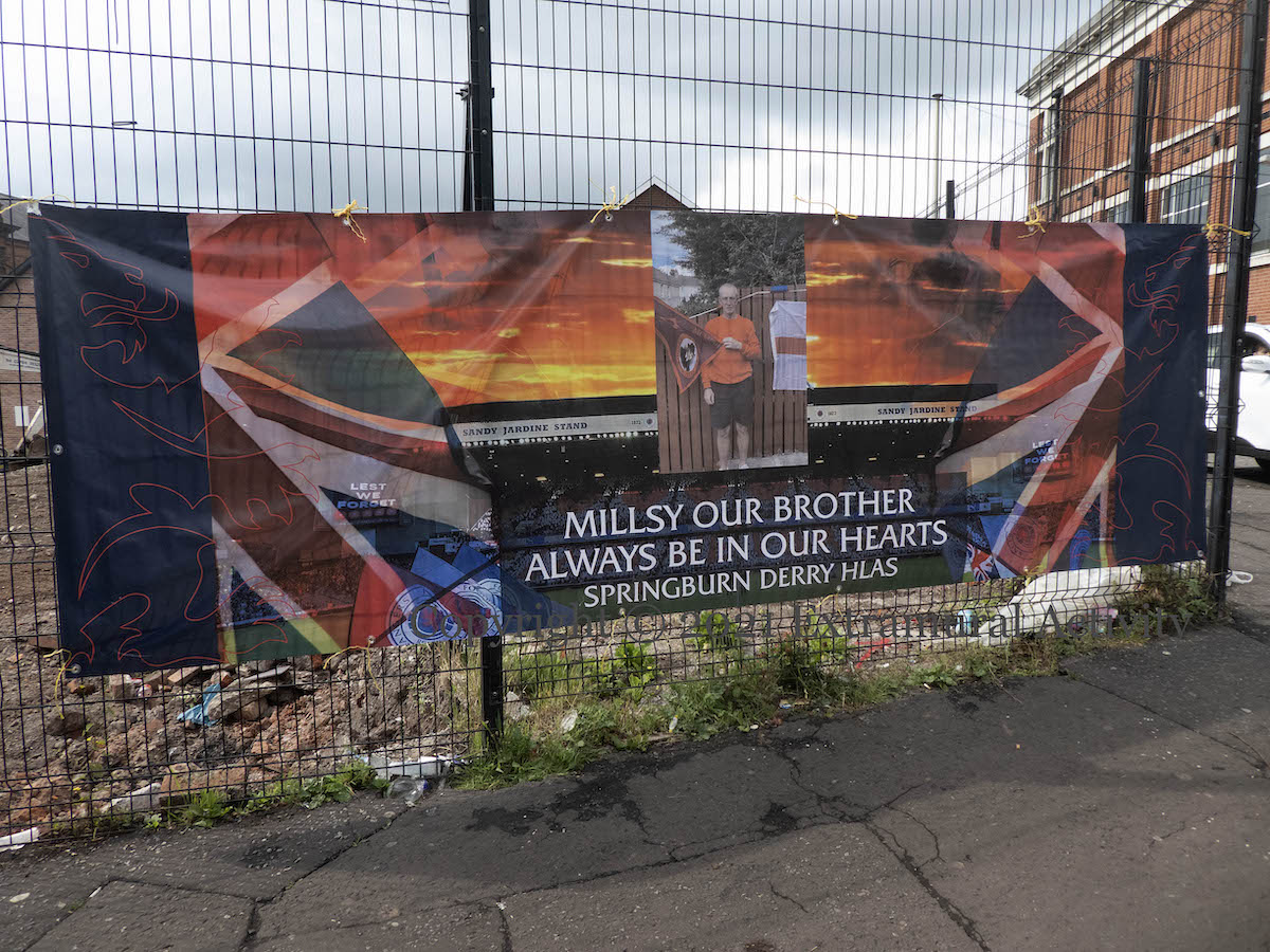 Another tribute to Scottish friends: “Millsy our brother, always be in our hearts. Springburn Derry (Fb)”. Please get in touch if you have any information about “Millsy”, from Springburn in Glasgow, Scotland and supporter of Rangers (the north stand at Ibrox is named after Sandy Jardine, star player for Rangers (and Scotland) in the 1970s (WP)).