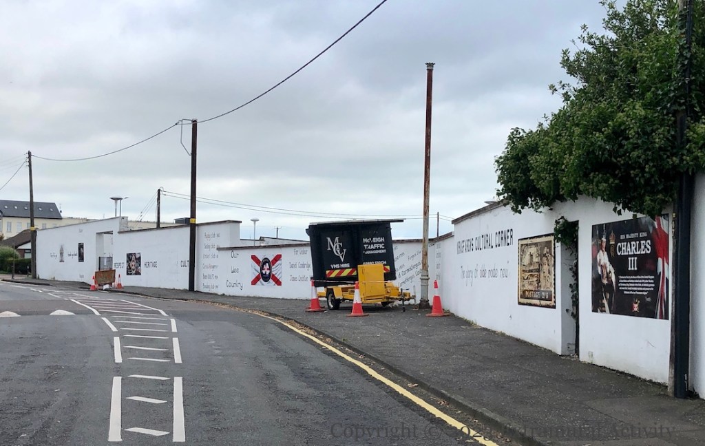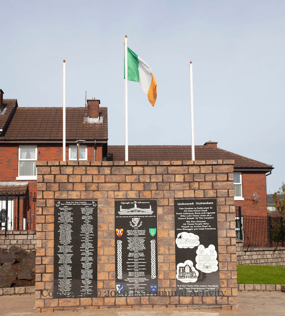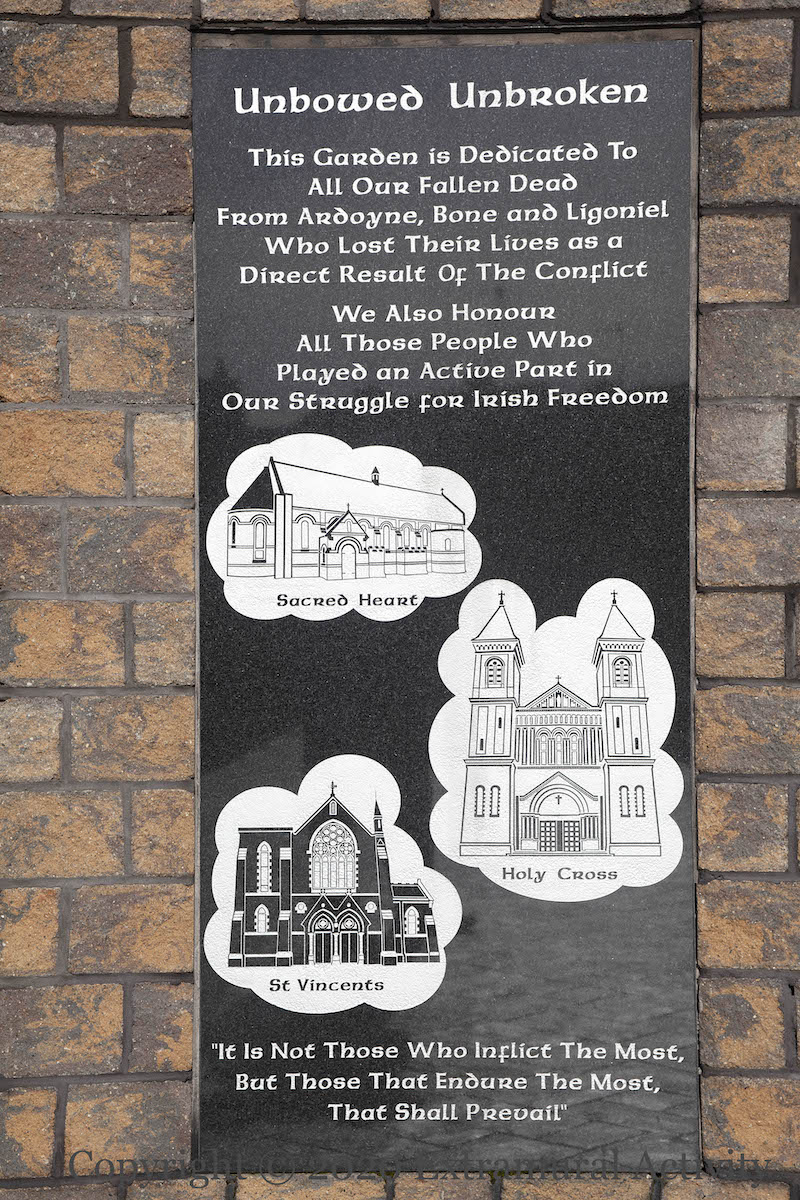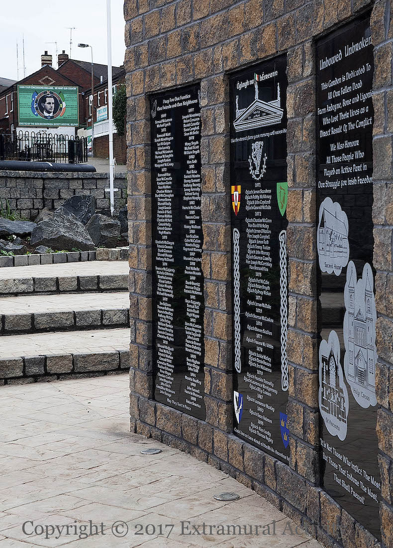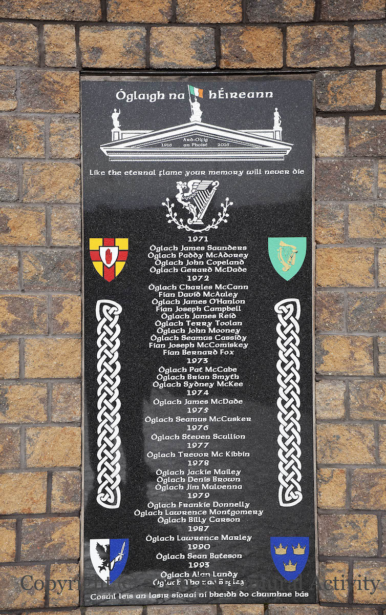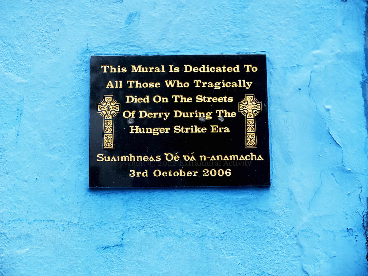 The wall was completed by early December, 2024, and the roll of honour added in the top-left corner by the end of the month. Those listed are: Hugh Ferguson, Danny Loughran, Brendan McNamee, Miriam Daly, Ronnie Bunting, Noel Little, Jim Power, Matt McLarnon, Joe Craven, Paul “Bonanza” McCann, Thomas “Ta” Power, John O’Reilly, Mickey Kearney, Emmanual Gargan, Gino Gallagher, John McColgan, Patrick Campbell, Christopher “Crip” McWilliams, Harry O’Hara, Barry “Bar” McMullan, Martin McElkerney, James McWilliams. The last five post-date the Agreement, starting with Patrick Campbell, who died in 1999 at the hands of drug-dealers in Dublin (Irish Times | Bel Tel).