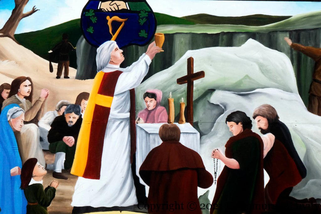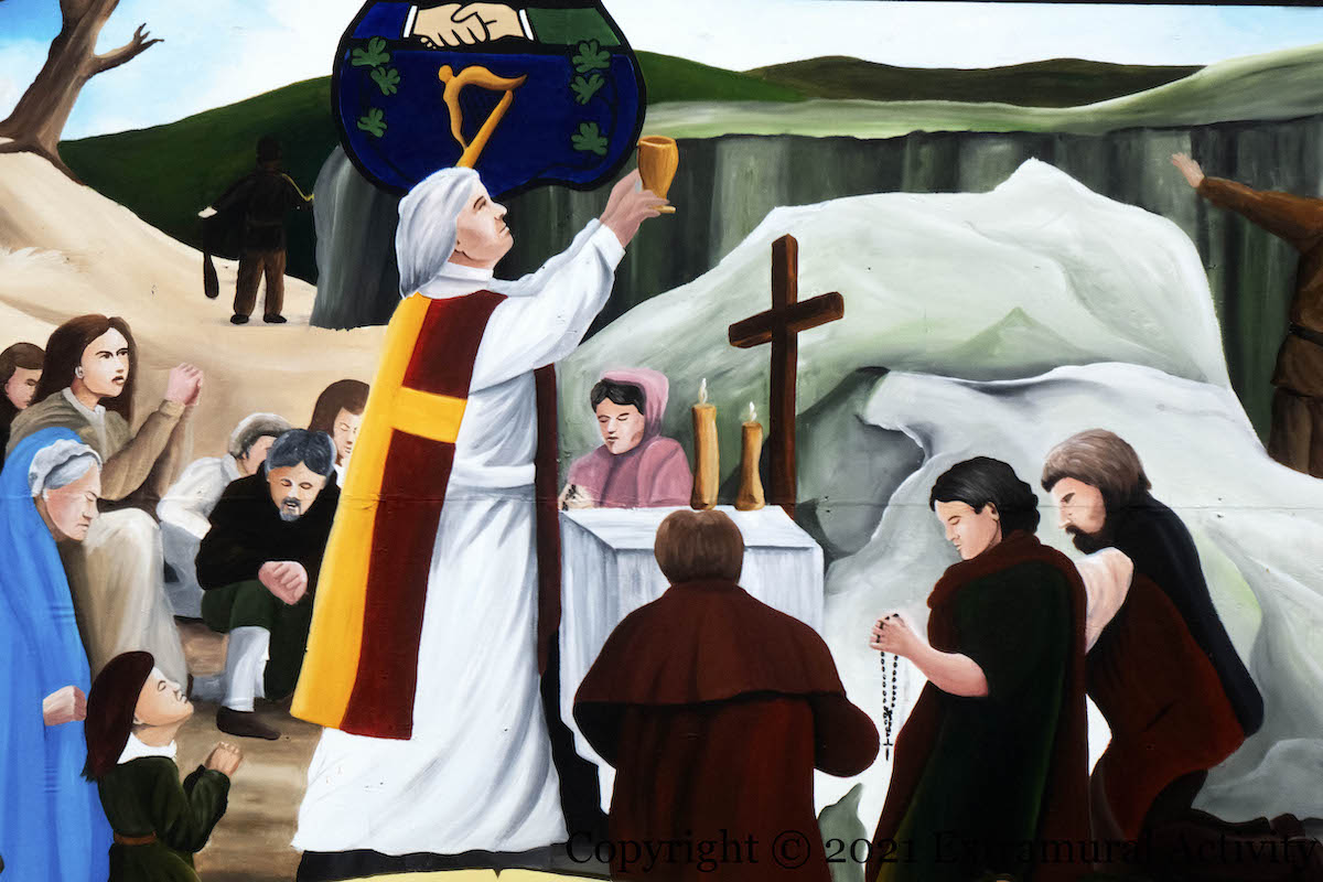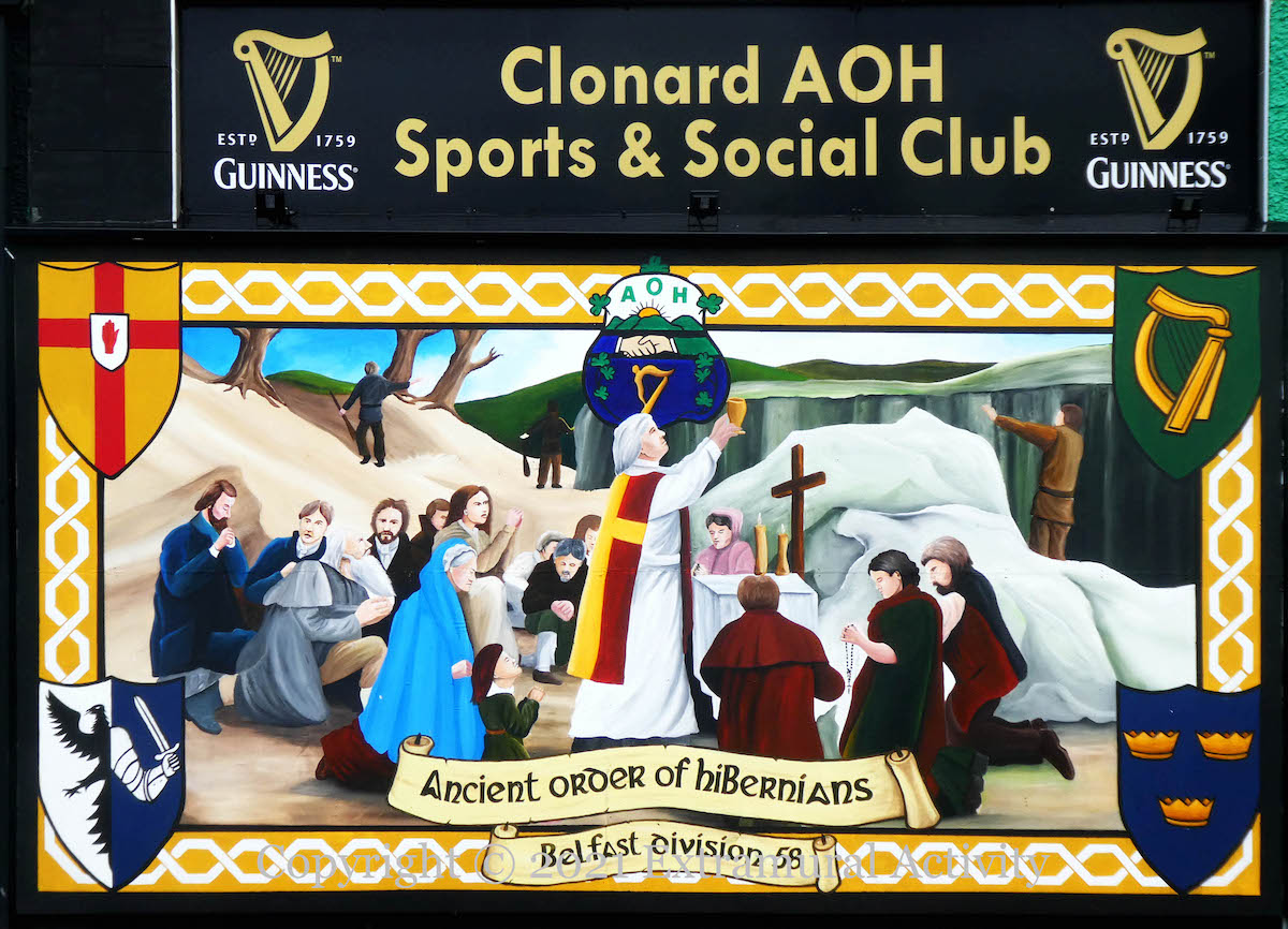 A Penal law of 1695 forbade the practice of Catholicism and “dissenter” forms of Protestantism –anything other than Anglicism, forcing people and priests to worship in secret. Although the precise date of the founding of the Ancient Order Of Hibernians is shrouded by the existence of various other Catholic fraternal and defensive organisations such as St Patrick’s Fraternal Society and the Ribbonmen – the AOH history page gives 1838 in Pennsylvania – the order traces its roots back to Penal times and in particular to the Defenders in 1784, which arose to protect Catholics from the (Protestant) Peep-O-Day Boys and in defiance of Penal laws forbidding Catholics to bear arms (WP). The Belfast division (58) of the AOH is in Clonard Street.