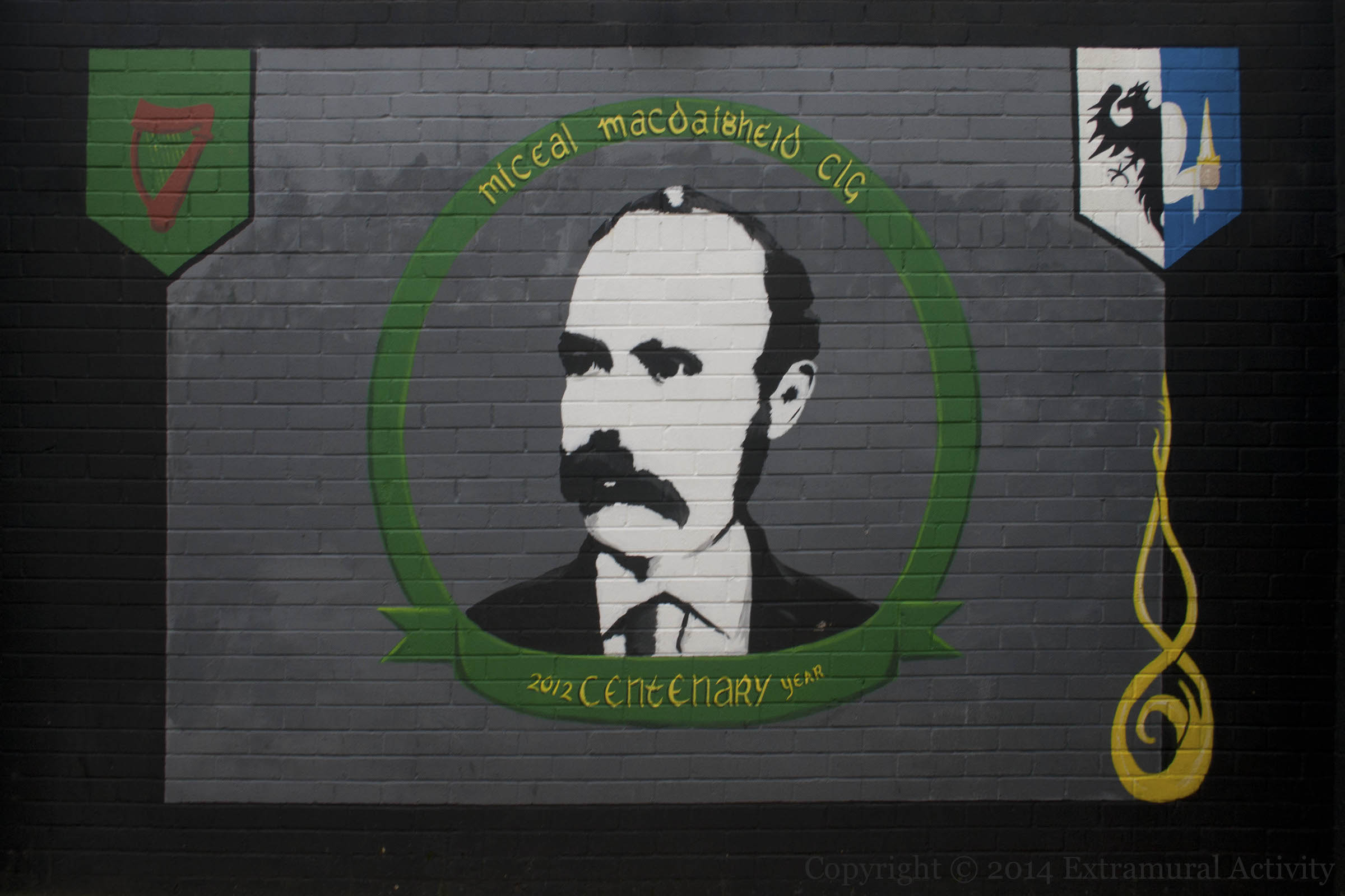 “Oppression breeds resistance”, in the form of Leila Khaled and an IRA gunman, and a clenched fist in the colours of the Palestinian flag. This is a new pro-Gaza mural in McQuillan Street with Irish “Tıocfaıdh ár lá” [our day will come] and Arabic “يومنا قادم” [our day is coming] (and in the shields “Saoırse” and “حرية”[freedom]).