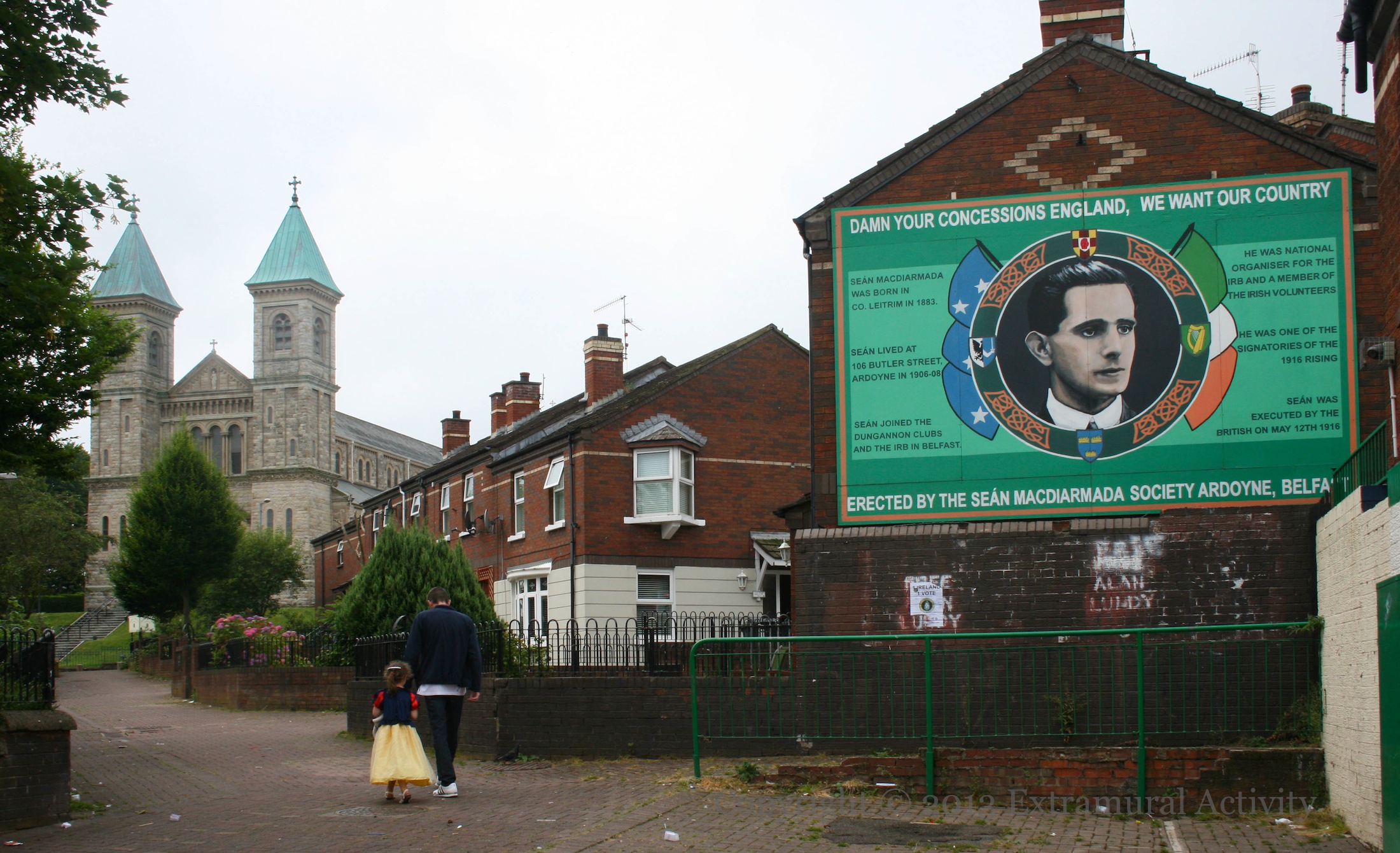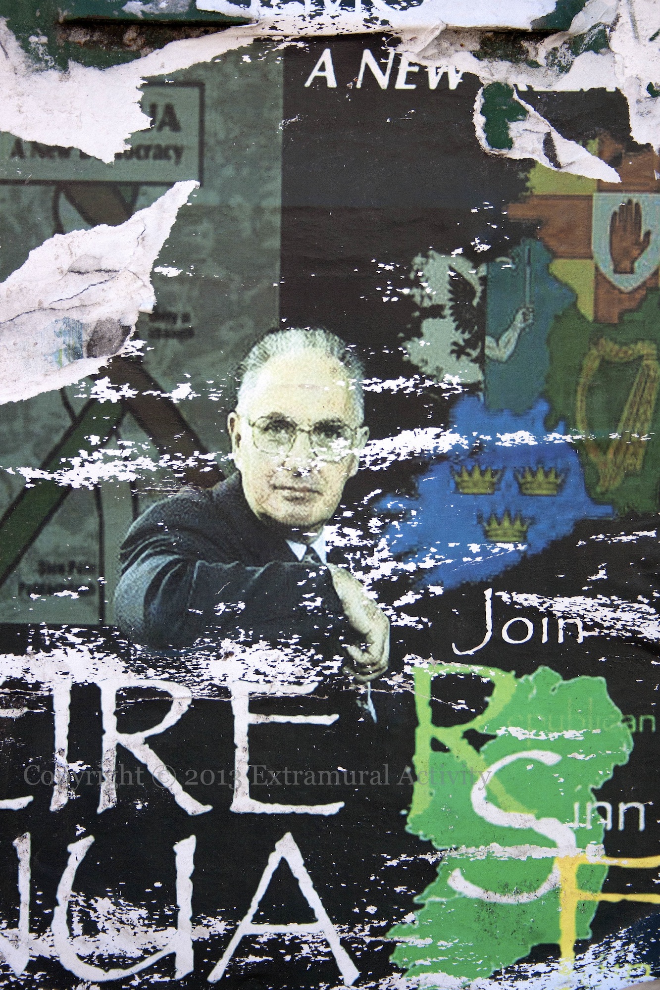 This is a recent poster (this one on the Antrim Road near Carlisle Circus) featuring the “Éıre Nua” plan of the 70s and 80s (which remains policy of Republican Sınn Féın, which split from Sınn Féın in 1986) and one of its authors, Ruaırí Ó Bradaıgh (WP). The plan calls for four parliaments, one in each of the four provinces, with a capital in Athlone. A documentary, Unfinished Business, featuring Ó Bradaıgh, can be seen here.