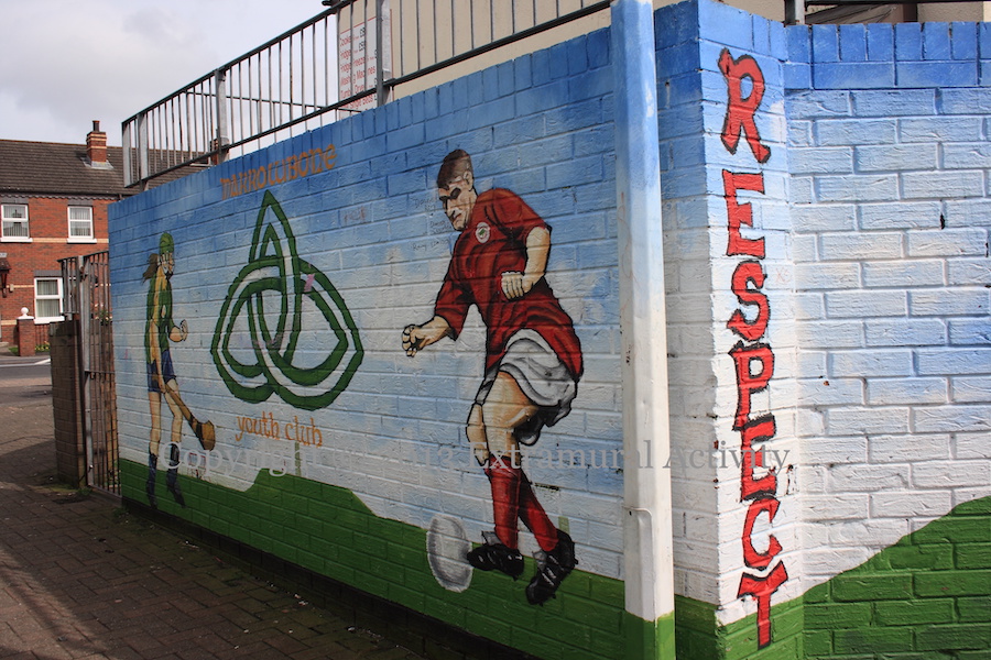 “Machaıre Botháın” [Bothain] (Marrowbone) Youth Club mural just off Oldpark Road, celebrating Gaelic games, Cliftonville soccer, Antrim, and the four provinces of Ireland.