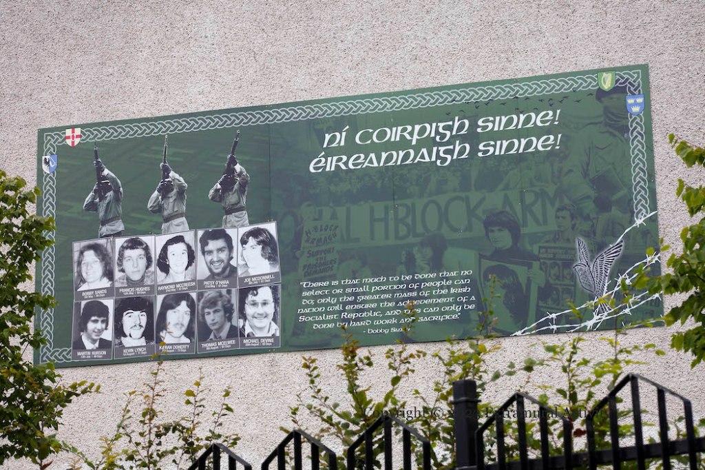 “From a casual meeting alongside Marty and Micky at work repainting the Vol. Kieran Doherty mural in Andersonstown came an inspired suggestion that we accept a challenge from him to tell our story graphically on a canvas rather than the usual brick wall, not just on canvas to hang on a wall in his gallery in L.A. but a canvas to cover the entire wall 20ft x 7ft!