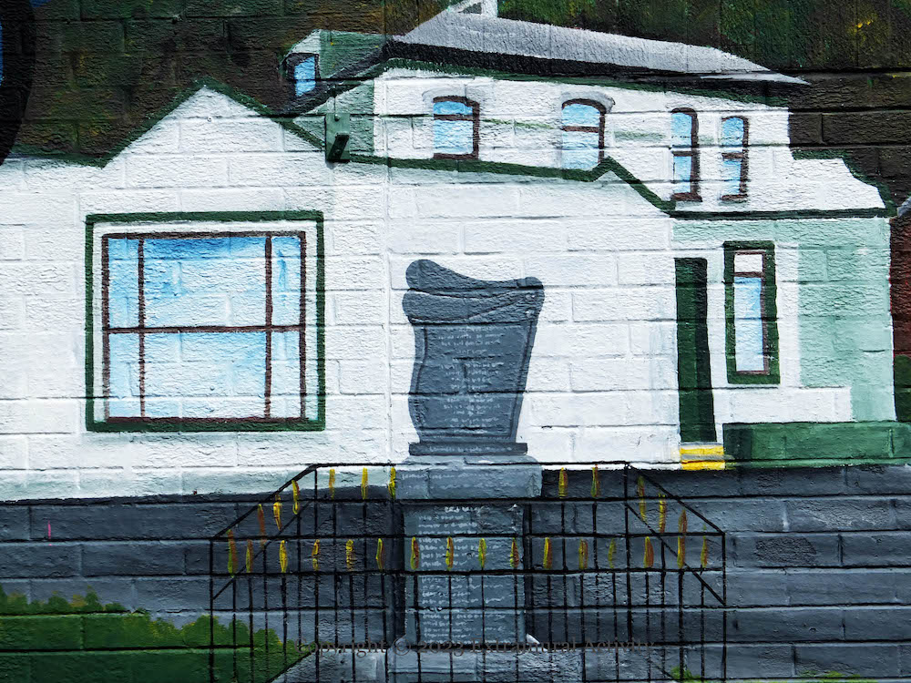 Féıle An Phobaıl (web) is now headquartered in the renovated (BCC) St Comgall’s on Divis Street in Ionad Eileen Howell, and during this year’s (2025) festival is home to an exhibition called “Vibrant Colours, Violent Past”, the centrepiece of which is a 20-foot-long panoramic history of republicanism, with Wolfe Tone, James Connolly, and Martin McGuinness as pivotal figures.