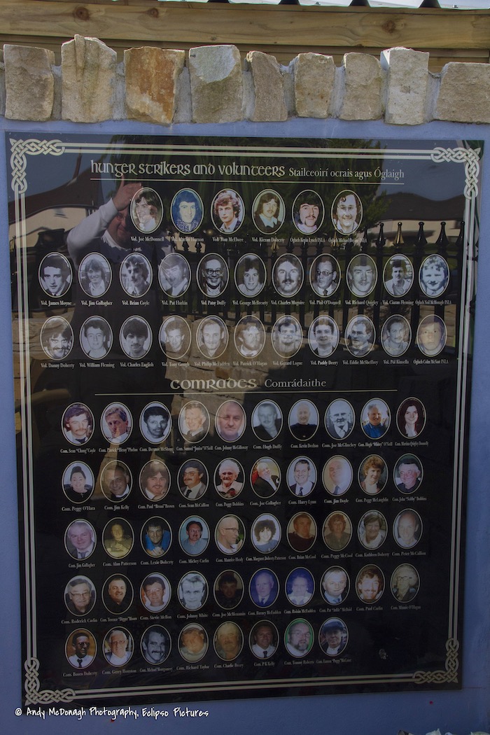 “From a casual meeting alongside Marty and Micky at work repainting the Vol. Kieran Doherty mural in Andersonstown came an inspired suggestion that we accept a challenge from him to tell our story graphically on a canvas rather than the usual brick wall, not just on canvas to hang on a wall in his gallery in L.A. but a canvas to cover the entire wall 20ft x 7ft!
