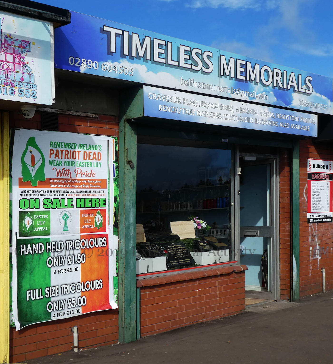 Discounts on hand-held and full-size Tricolours “in memory of all of those who have given their lives in the cause of Irish freedom” from the Milltown engravers – next to the Kurdish barbers – on the Falls Road.