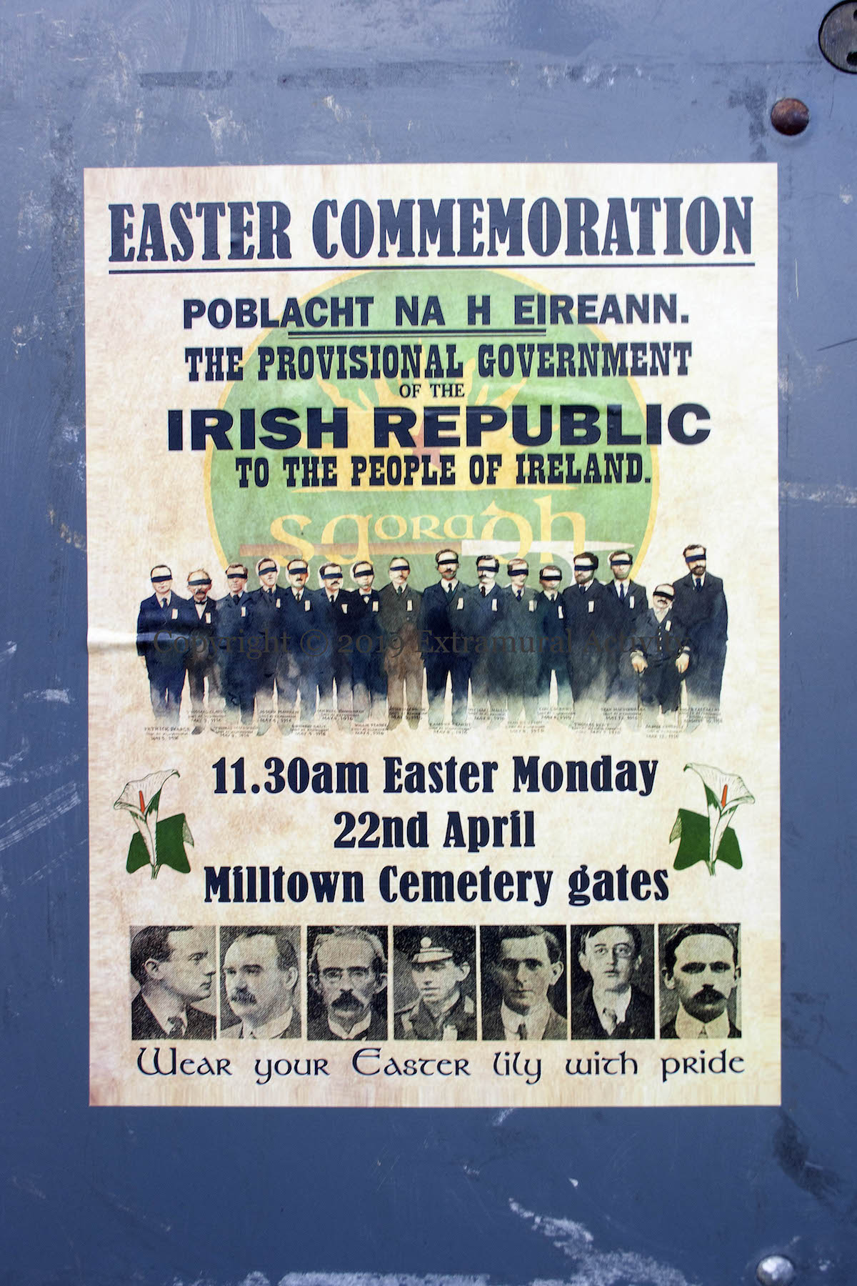 16 republicans, the seven signatories of the Proclamation among them, were executed in the wake of the Easter Rising, 14 of them in Dublin in a 10-day period from May 3rd to 12th. They are depicted in this Saoradh (web | tw) poster blindfolded and wearing suits: (from left to right) Patrick Pearse, Thomas Clarke, Thomas MacDonagh, Joseph Plunkett, Edward Daly, William Pearse, Michael O’Hanrahan, John MacBride, Éamonn Ceannt, Michael Mallin, Seán Heuston, Con Colbert, James Connolly, Seán MacDiarmada, Thomas Kent, and Roger Casement. Their deaths and the Rising are commemorated in Belfast each Easter with a parade
