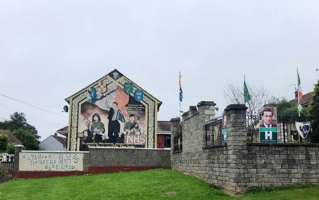 A home-made sign on cardboard “NHS – stay safe” has been attached to the mural to IRA volunteers Bobby McCrudden, Mundo O’Rawe, and Pearse Jordan, and the wall below it painted with the message “Stay home – Protect the NHS – Save lives”.