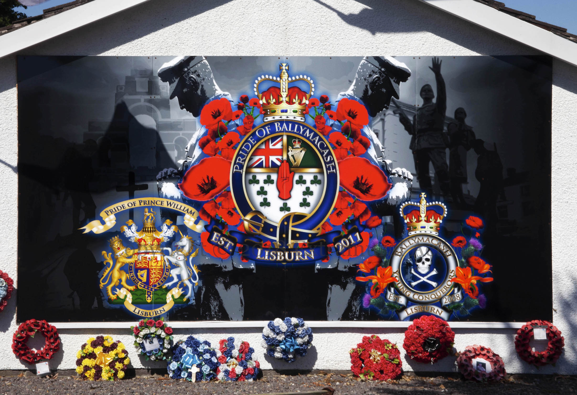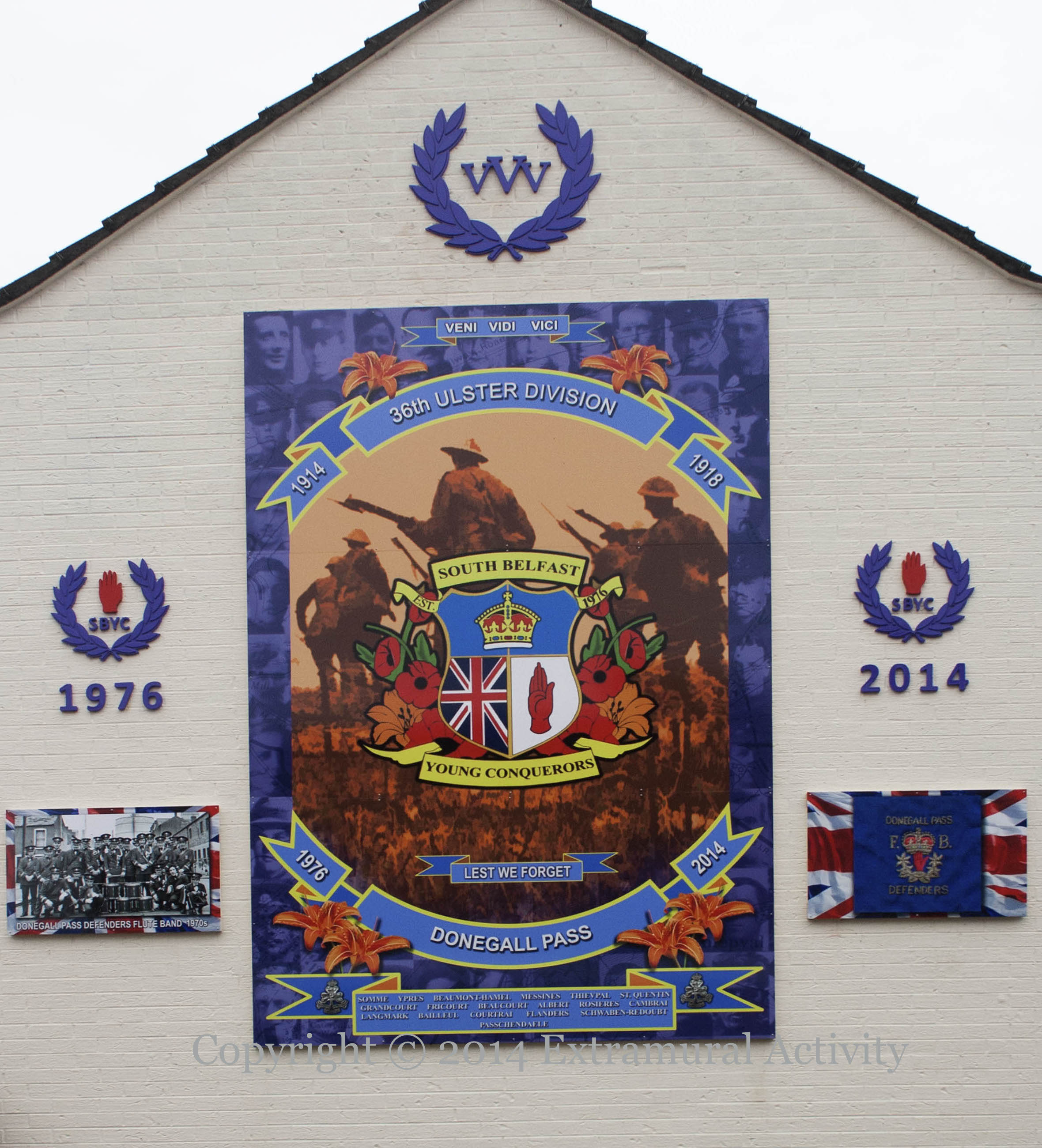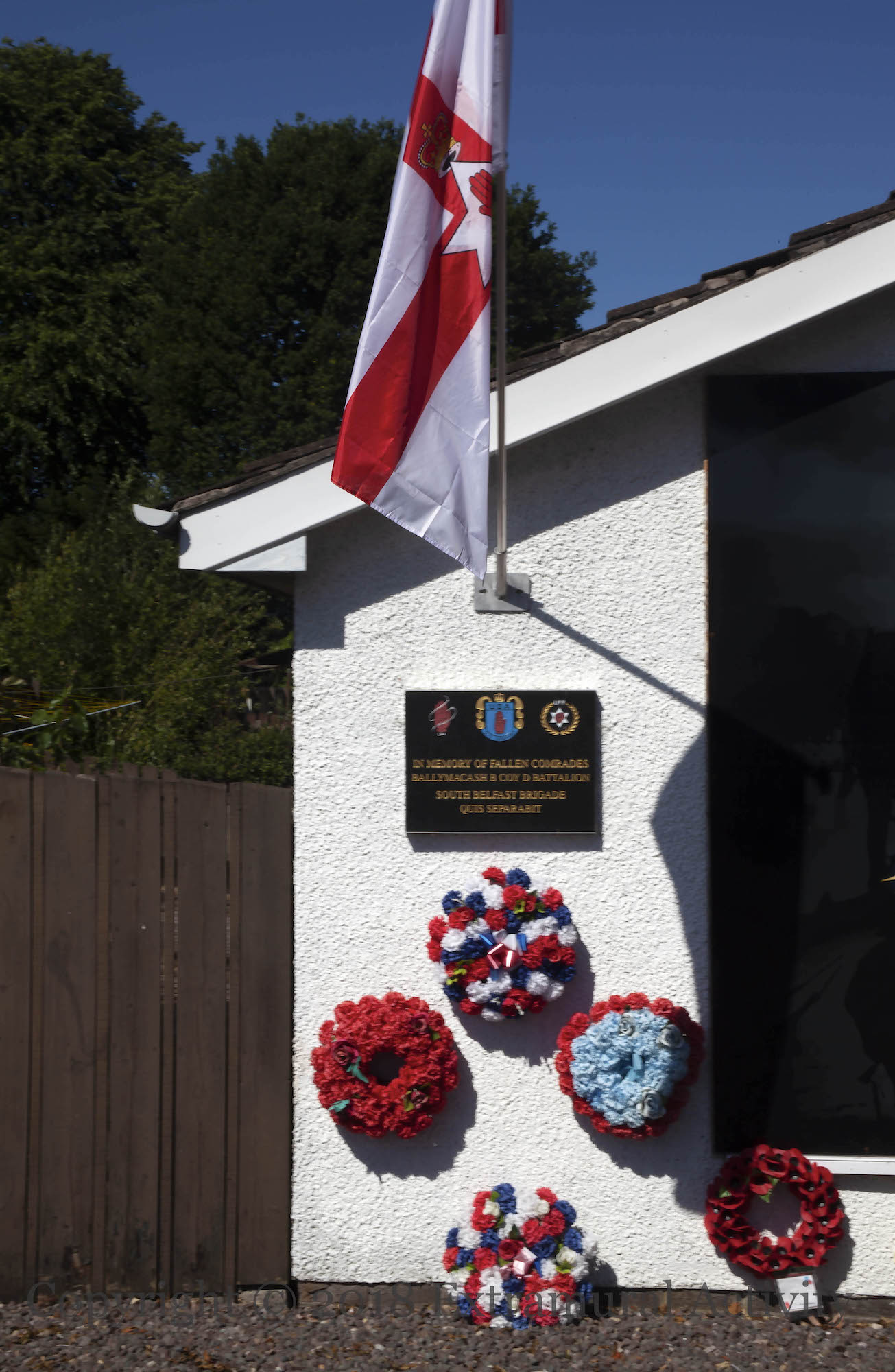 The Pride Of Ballymacash flute band, formed in 2011 from the Pride Of Prince William (bottom left) and Ballymacash Young Conquerors (bottom right), uses the emblem of the 36th (Ulster) Division, in the centre of the mural. In the background on the left is the Thiepval Memorial and, on the right, the UDR memorial statue in Market Square, Lisburn. To the left (in the second image) is a UDA plaque “In memory of fallen comrades Ballymacash B coy D battaltion, South Belfast Brigade. Quis separabit.” For a close-up of the memorial on the ground, see Death & Life.