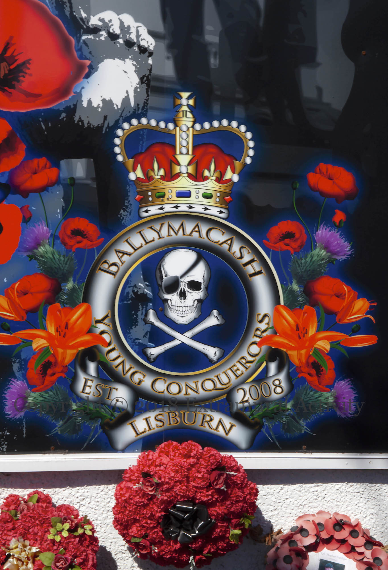 The skull-and-crossbones is the emblem of the Ballymacash Young Conquerors, which merged with the Pride Of Prince William in 2011 to form the Pride Of Ballymacash. (Fb) The symbol is a potent one, however, and still used by the new band in addition to its own. In the mural in its memorial garden, it is surrounded by poppies, thistles, and orange lilies. If you know the name of the young man in the memorial display (second image), please comment/get in touch.