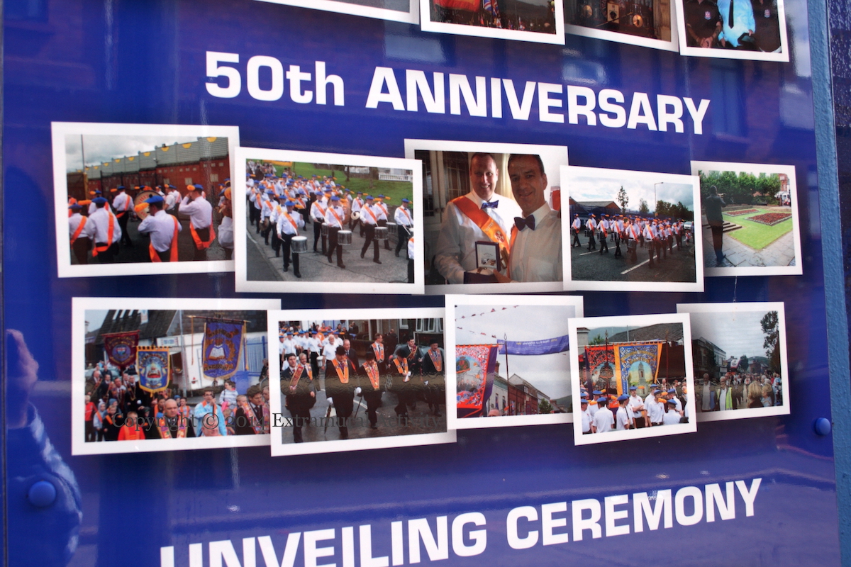 The board on the right reads “Centenary of cultural expression 1921-2021. Sons Of Belfast LOL 743. Castleton Temperance LOL 867. The Memorial LOL 1197. Belfast Harbour LOL 1883. The Coote Memorial LOL 1921. Cave Hill Temperance LOL 1956.”