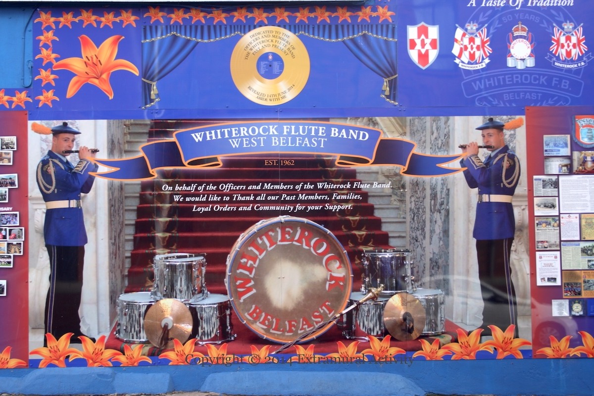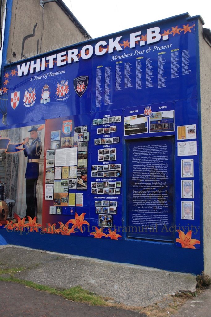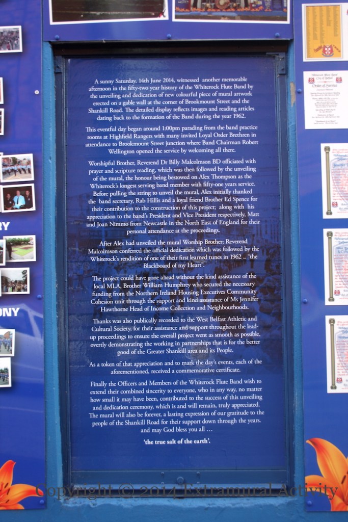 “A sunny Saturday, 14th June 2014, witnessed another memorable afternoon in the fifty-two year history of the Whiterock flute band by the unveiling and dedication of new colourful piece of mural artwork erected on the gable wall at the corner of Brookmount Street and the Shankill Road. The detailed display reflects images and reading articles dating back to the foundation of the band during the year 1962.