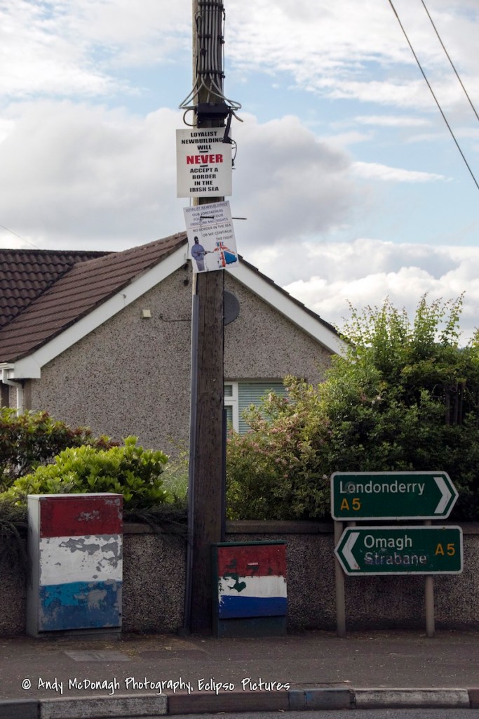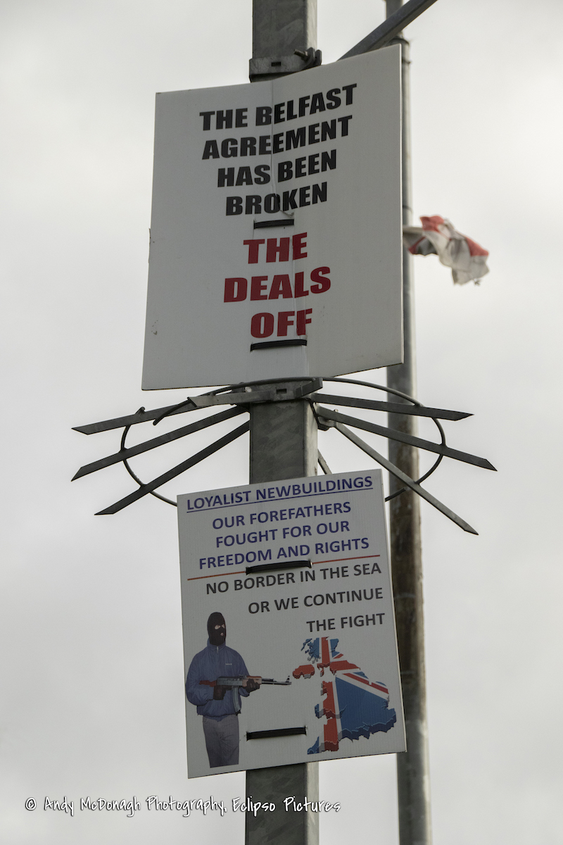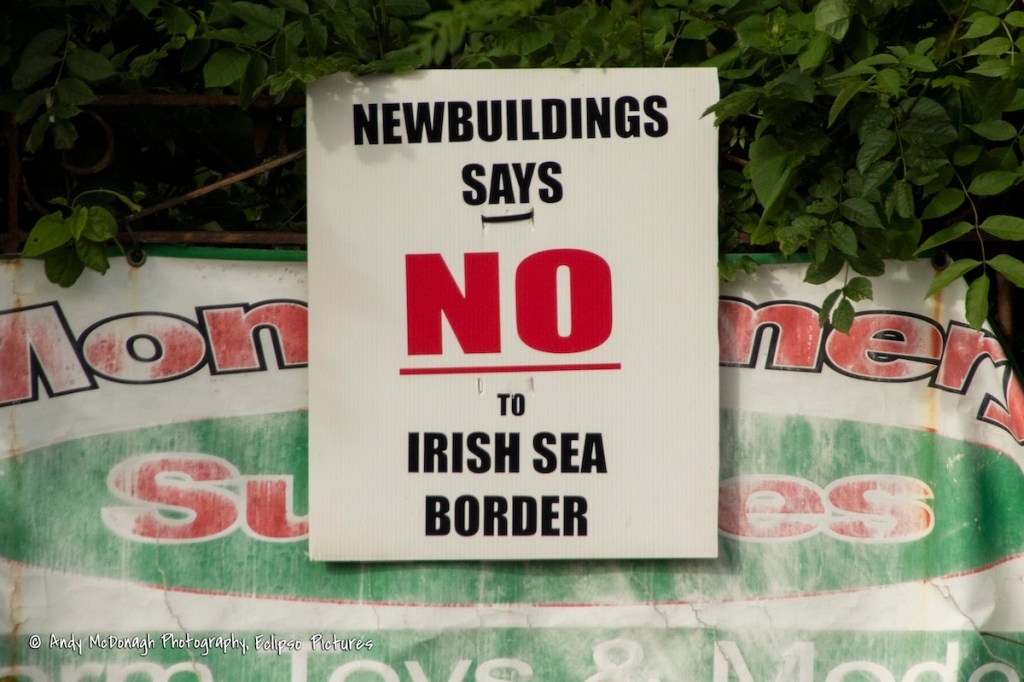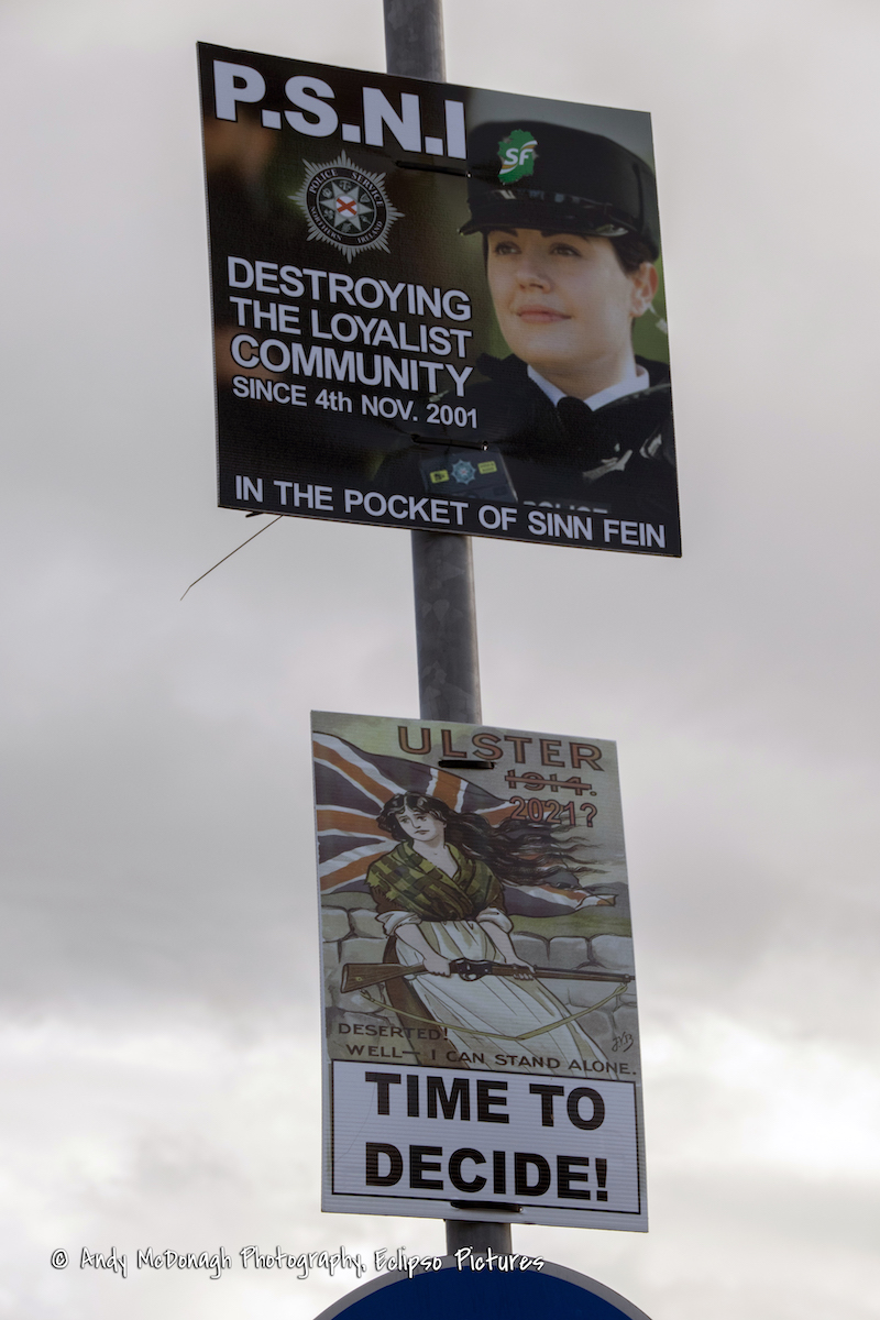 Here is a selection of anti-Protocol placards from the Caw, Londonderry and Newbuildings. Above: a PSNI officer with a Sinn Féin badge – “PSNI – destroying the loyalist community since 4th Nov. 2001. In the pocket of Sinn Féin.” (November 4th, 2001 is the date the PSNI was created.) For the farmer’s wife protecting the farm, see Deserted, well I can stand alone. Below: “Newbuildings says No to Irish Sea border”, “Loyalist Newbuildings will never accept a border in the Irish Sea”, “The Belfast Agreement has been broken – the deal’s off”, and “Our forefathers fought for our freedom and rights/No border in the sea or we continue the fight”.